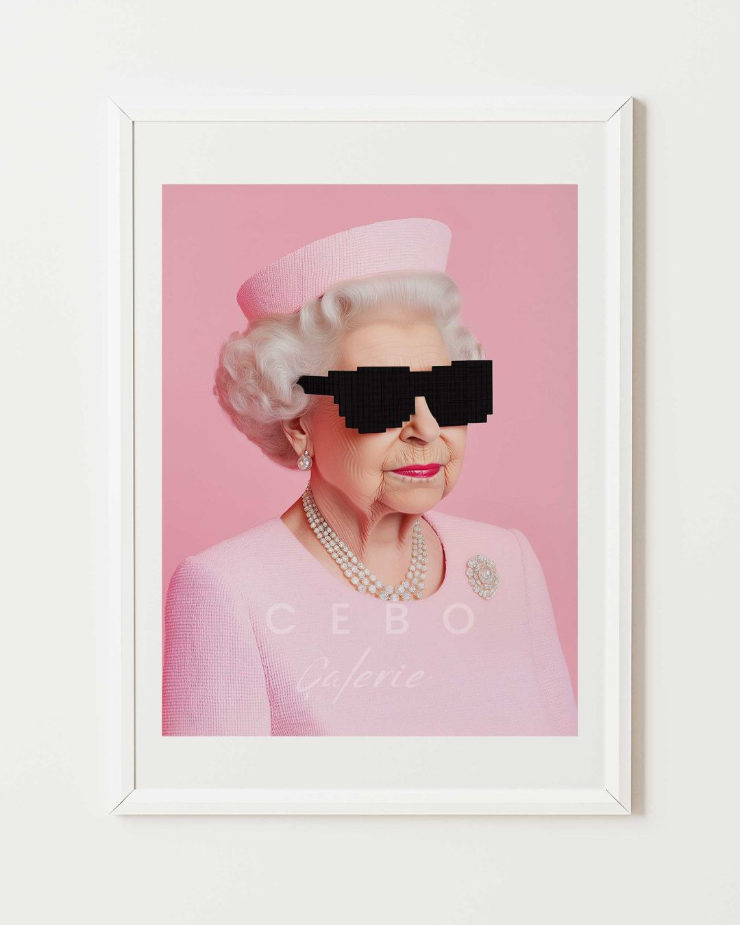 'Pixel Queen' Art Poster , this poster shakes up the codes of royalty with audacity and humor. In this conceptual and ultra-graphic composition, Queen Elizabeth II wears a pink suit perfectly matching the monochrome background... but it's her black pixel glasses that steal the show. The clash of styles —between monarchical classicism and digital imagery—gives birth to a work that is at once chic, irreverent and furiously contemporary.