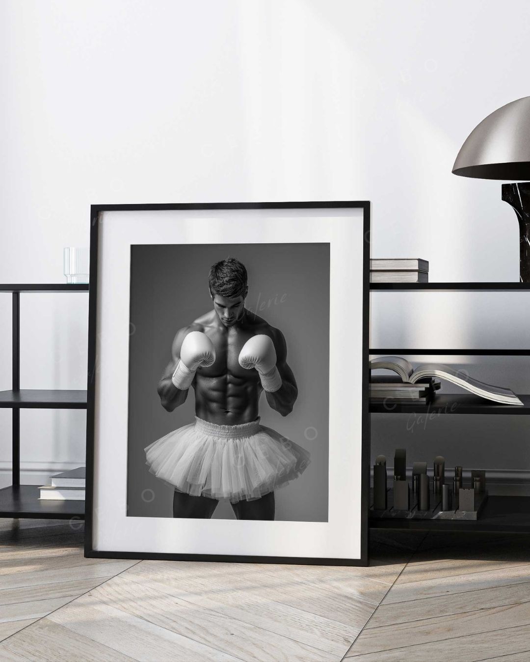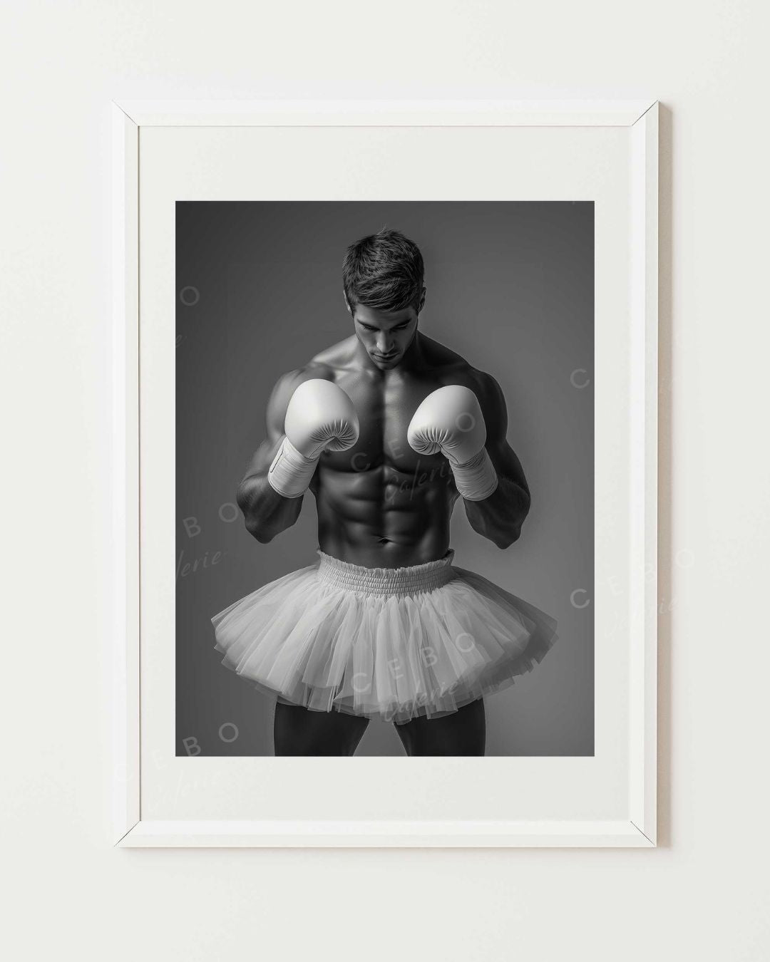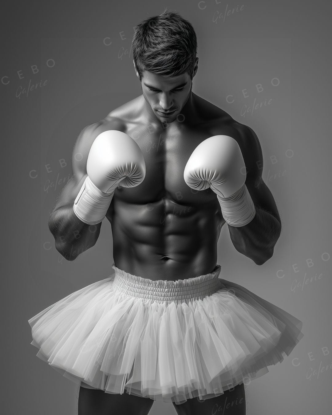 Das Schwarz-Weiß-Porträt zeigt einen athletischen Männerkörper in einer Pose, die gleichermaßen kämpferisch und zart wirkt. Die Boxhandschuhe, Symbole für Stärke und Kampfgeist, bilden einen Kontrast zur Leichtigkeit des Tanztutus und erzeugen so eine eindrucksvolle visuelle Spannung.