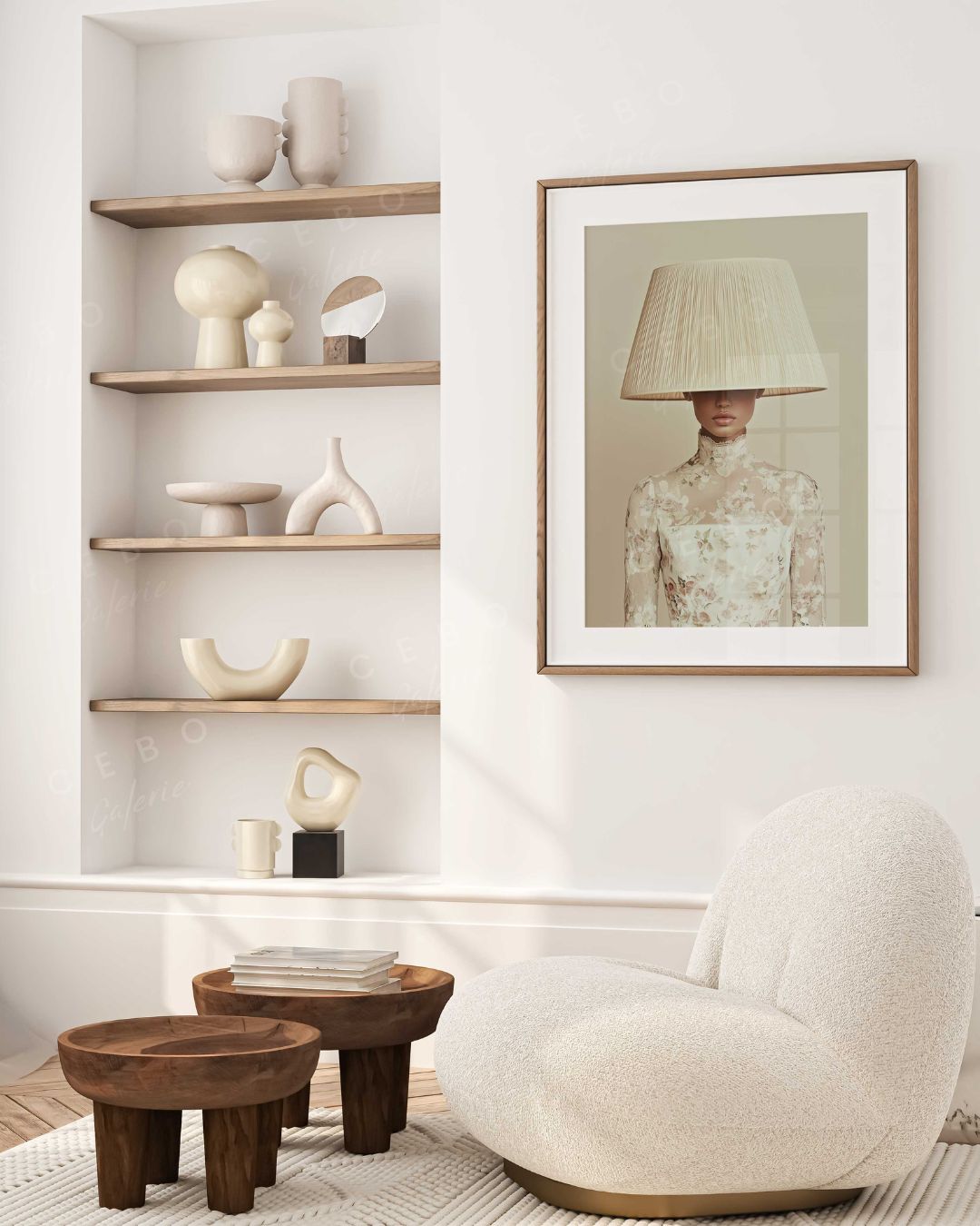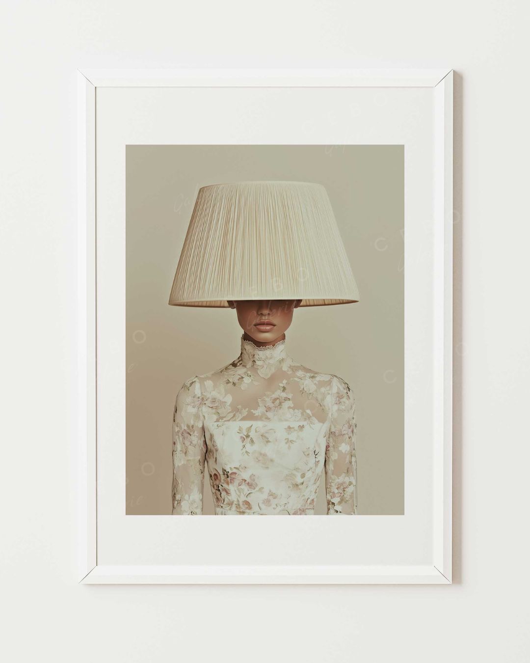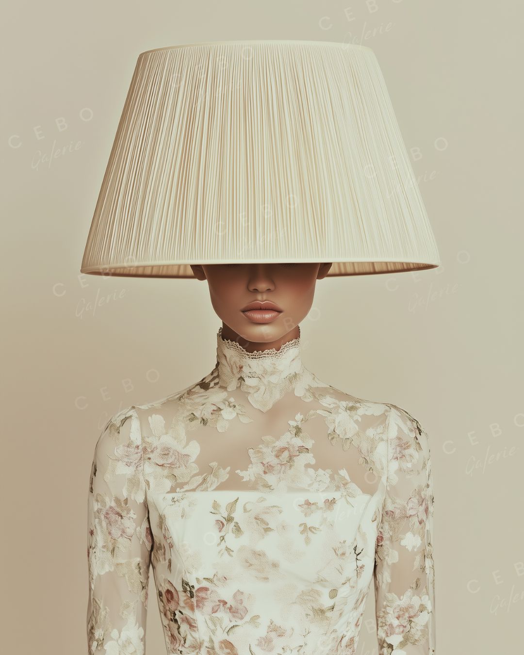 In diesem Porträt mit seiner Couture-Ästhetik verschwindet das Gesicht unter einem monumentalen Lampenschirm, der seinem ursprünglichen Zweck entrissen wurde. Diese kraftvolle visuelle Geste wird zur Metapher: für eine Weiblichkeit, die allzu oft zum Schweigen gebracht, anonymisiert und in Rollen oder Erwartungen gezwängt wird, die ihr nicht entsprechen. Und doch ist alles da – die Haltung, die Kleidung, die Präsenz. Die Stärke ist spürbar, selbst ohne Blick .