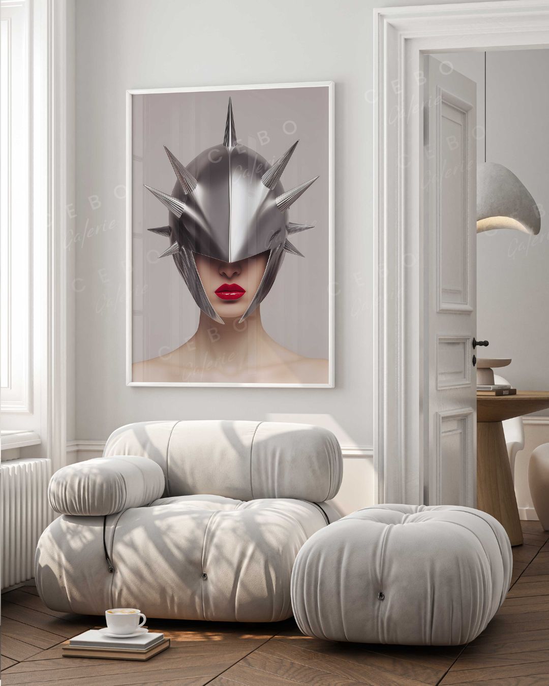 Das Kunstplakat „ Modern Warrior “ verkörpert eine kraftvolle und zeitgenössische Vision von Weiblichkeit an der Schnittstelle von Avantgarde-Mode , futuristischer Ästhetik und künstlerischem Manifest . Das Werk zeigt eine Frau, geschützt von einer skulpturalen Metallrüstung – einem Symbol für Stärke, Widerstandsfähigkeit und Selbstbeherrschung. Anstatt Weiblichkeit auszulöschen, unterstreicht und schützt diese Rüstung sie und bekräftigt so eine starke, freie und selbstbewusste Identität.