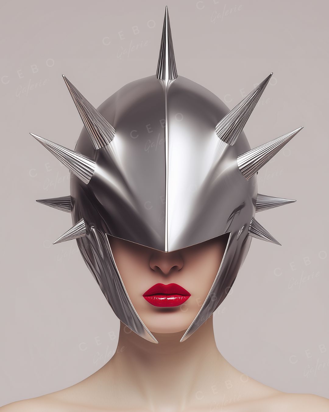 Der markante Kontrast zwischen der Kühle des Chroms und der Sinnlichkeit roter Lippen erzeugt eine fesselnde visuelle Spannung. Die Frau wirkt hier weder zerbrechlich noch passiv: Sie ist eine moderne Kämpferin, elegant und entschlossen, bereit, sich der Welt zu stellen, ohne ihre Individualität aufzugeben. Die Inspiration schöpft gleichermaßen aus experimenteller Haute Couture wie aus Science-Fiction und futuristischem Kino und schafft so ein Werk, das gleichermaßen ikonisch und zeitlos ist.