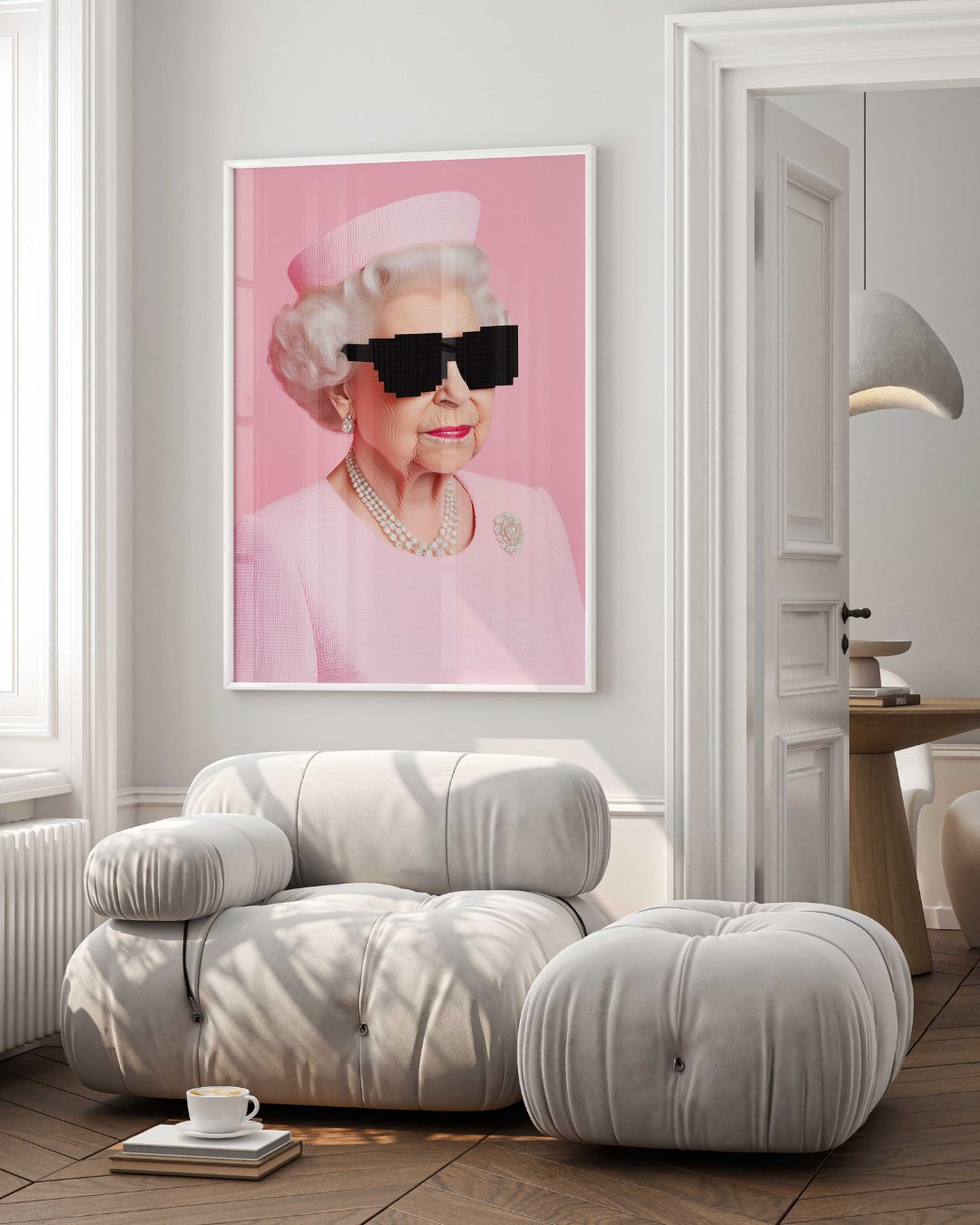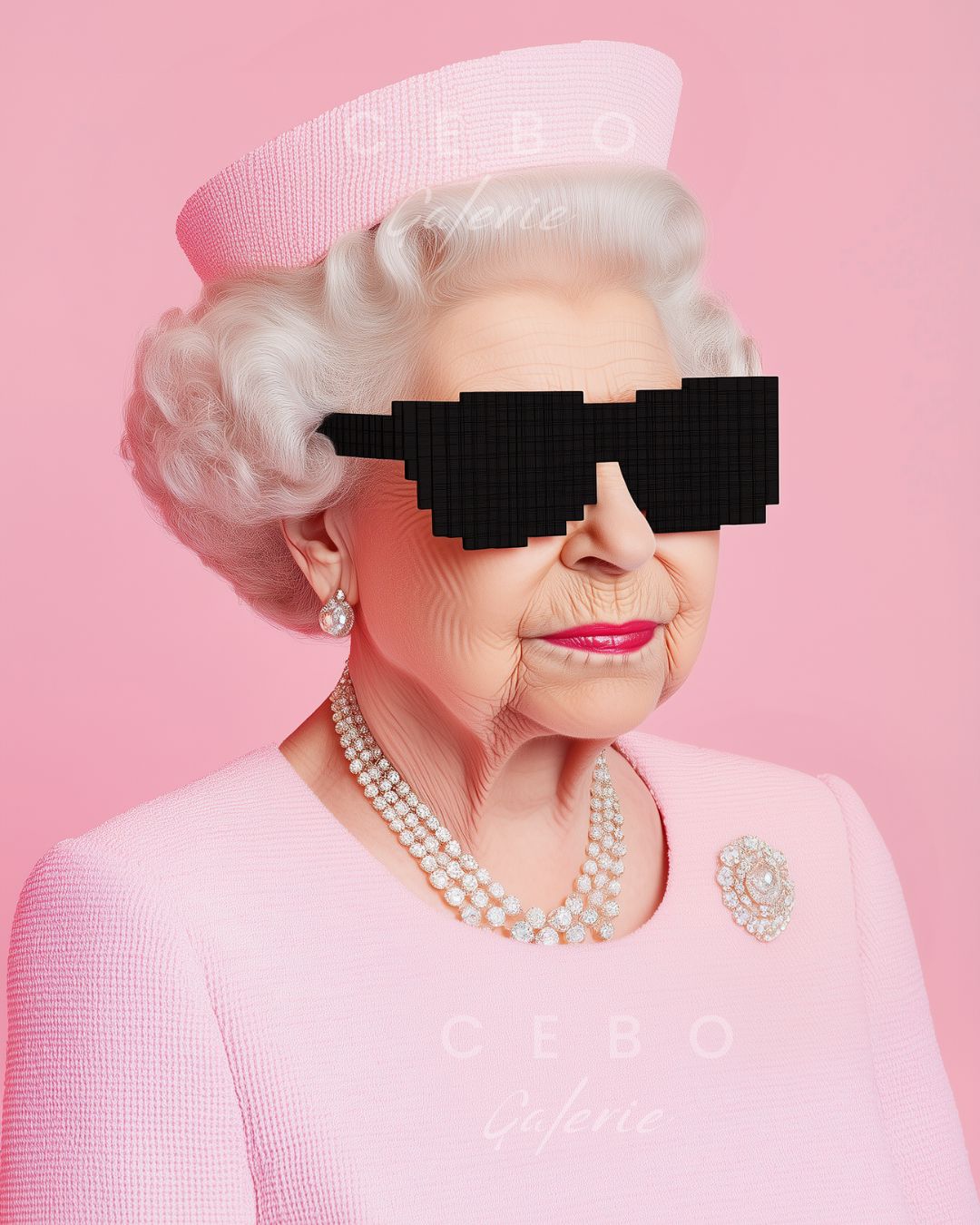 'Pixel Queen' Art Poster , this poster shakes up the codes of royalty with audacity and humor. In this conceptual and ultra-graphic composition, Queen Elizabeth II wears a pink suit perfectly matching the monochrome background... but it's her black pixel glasses that steal the show. The clash of styles —between monarchical classicism and digital imagery—gives birth to a work that is at once chic, irreverent and furiously contemporary.