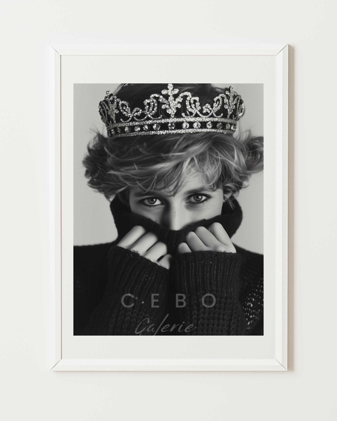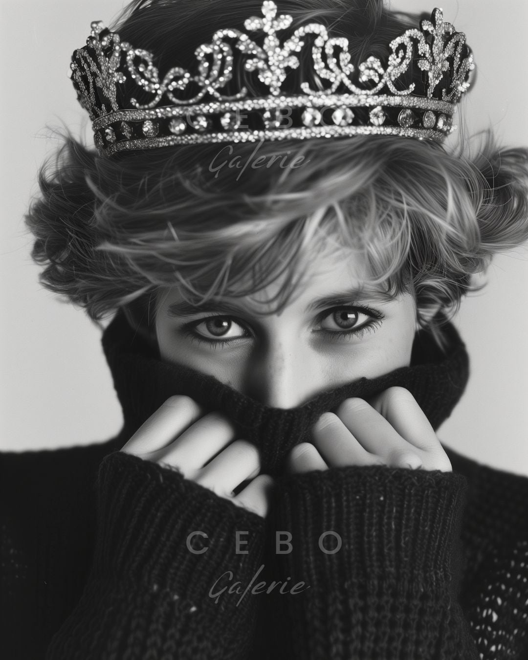 This work pays homage not only to the iconic royal figure of Lady Diana, but also to the beauty of minimalist photography . The elegant and understated black and white highlights every detail, from the soft texture of the sweater to the serene and contemplative expression of the princess.