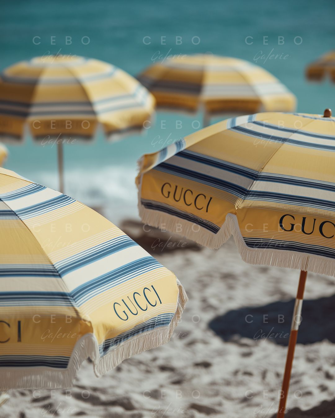 Art Poster ' Dolce Vita ', Escape to the sun with Dolce Vita , a photographic art poster that captures the luminous elegance of a summer day by the sea . Yellow and blue striped parasols , marked with an evocative logo of luxury , stand on a white sand beach, creating a setting that is retro, chic and resolutely fashionable.