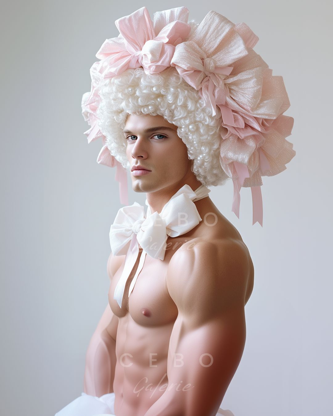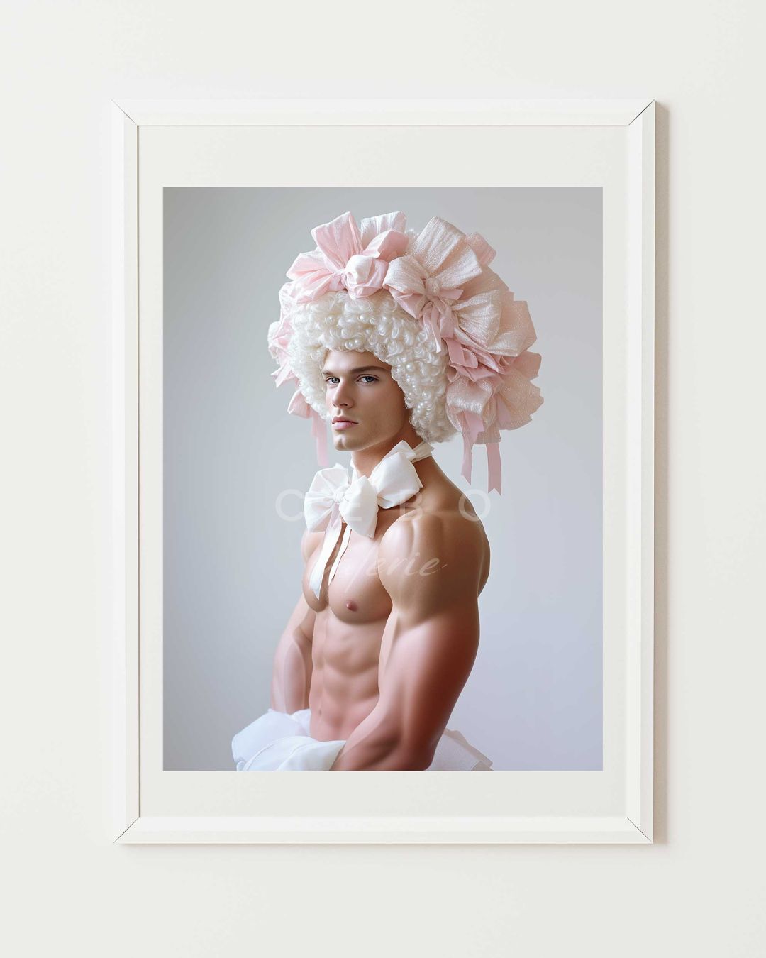 Art Poster 'The Queen's Favorite' , an artistic poster where tradition and innovation merge in a spectacular way. This minimalist creation features a muscular young man , bare-chested, wearing a white bouffant wig adorned with bright pink and white bows. On a light gray background, he evokes a courtier from the court of Marie Antoinette , famous for defying the strict conventions of Versailles.