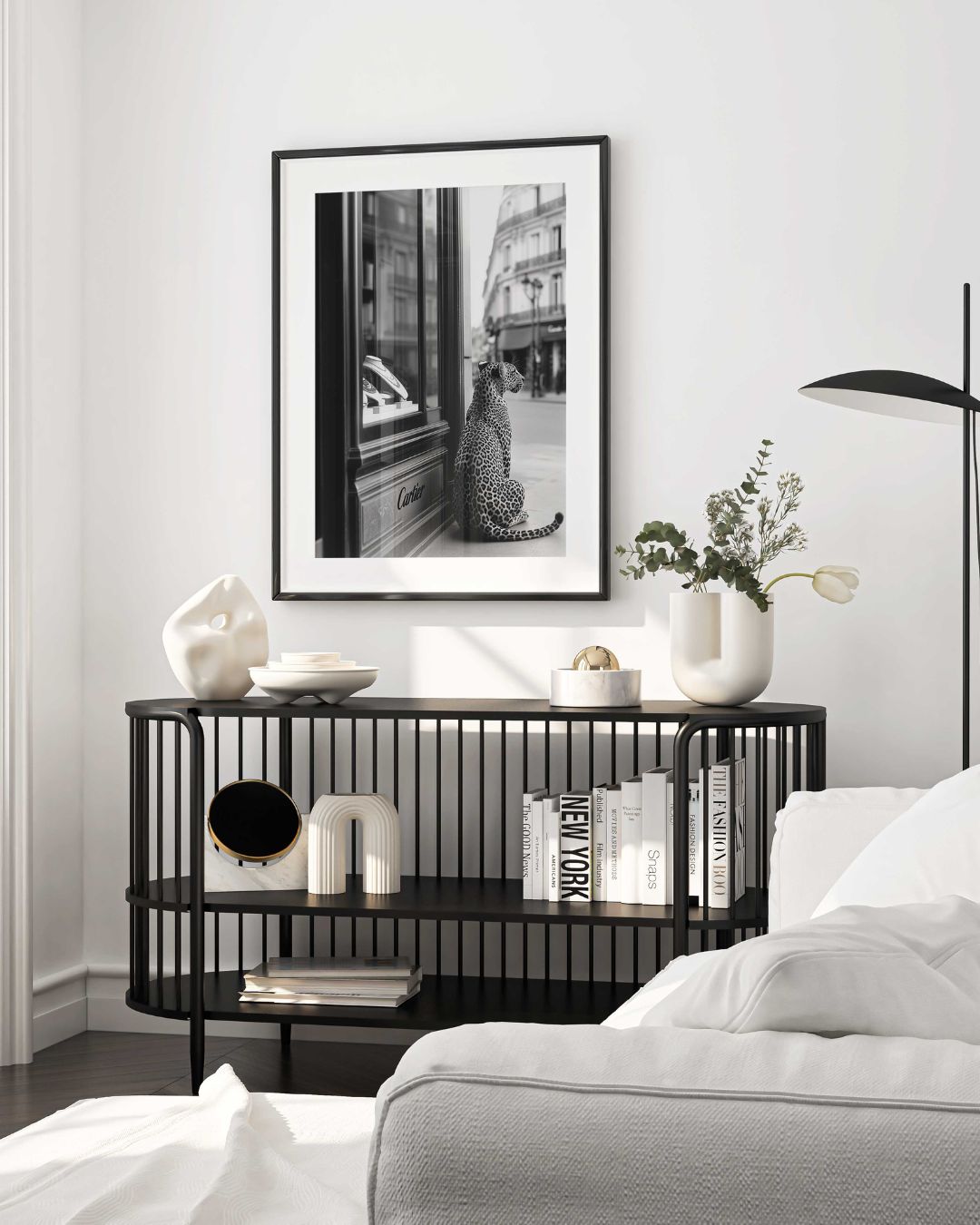 Art Poster ' Panther in Paris ', an elegant and striking scene, capturing a leopard sitting in front of the window of a famous Parisian jewelry house . In black and white, with an aesthetic, this work summons both the feline allure, the world of luxury and the imagination of fashion.