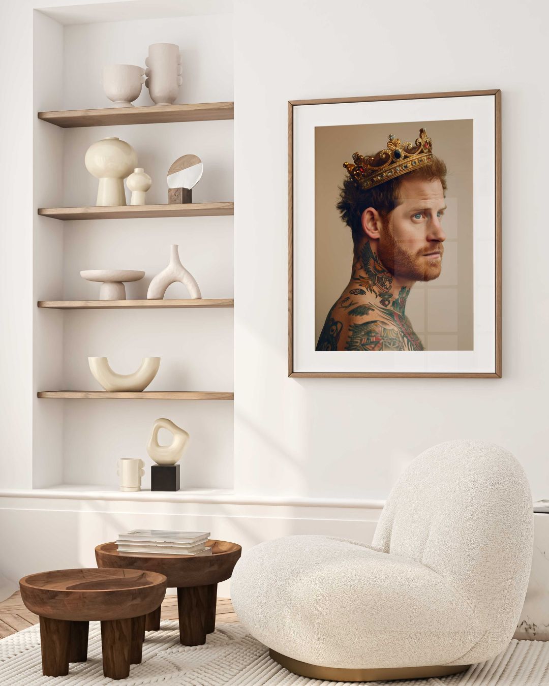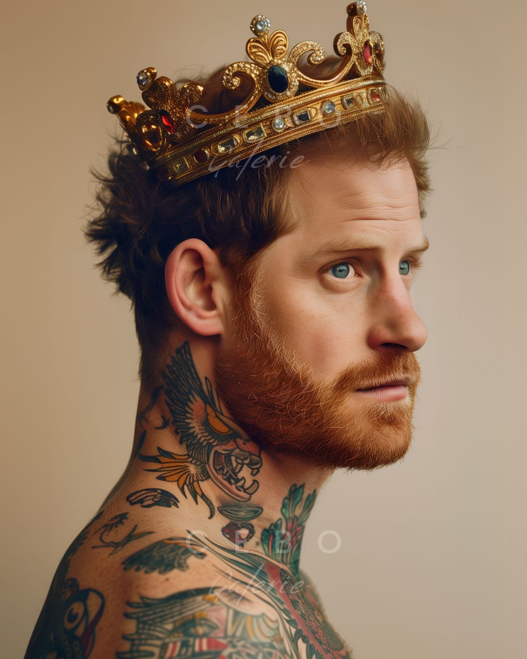 'Rebel Harry' Art Poster, a conceptual and minimalist work that captures the rebellious and resolute side of Prince Harry . In this striking portrait, the prince wears a crown while displaying tattoos on his neck and shoulders , adding an unexpected touch to this royal figure. Posed in profile, with his gaze fixed into the distance, he embodies both tradition and modernity , heritage and freedom .