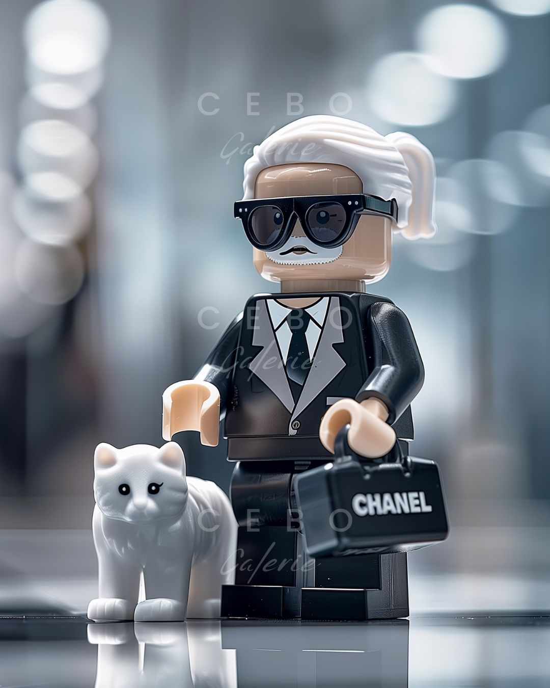 "Karl's Lego" Painting , immerse yourself in the world of fashion with a unique, detailed and elegant painting that pays conceptual homage to Karl Lagerfeld . This unique piece of art brilliantly captures a stylized Lego figure of the famous designer, complete with his signature ponytail and black sunglasses. He holds a black bag adorned with the iconic CHANEL letters, while his faithful companion, Choupette , is depicted as a white Lego cat .