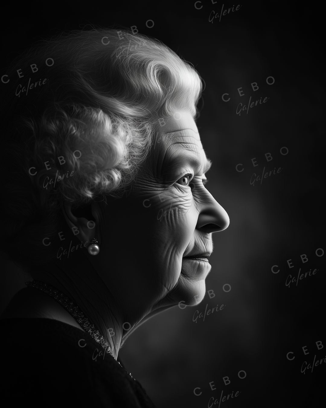 The painting “Queen’s Gaze” is a work that is both understated and powerful , capturing the profile of an iconic sovereign in a black and white portrait of rare intensity. Every wrinkle, every shadow, and every reflection tells a story: that of a reign, an era, a legacy.