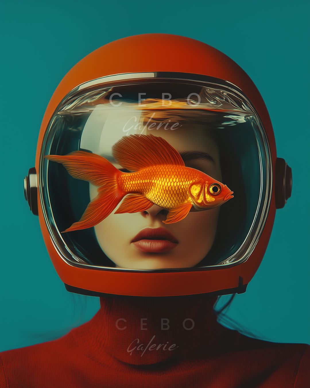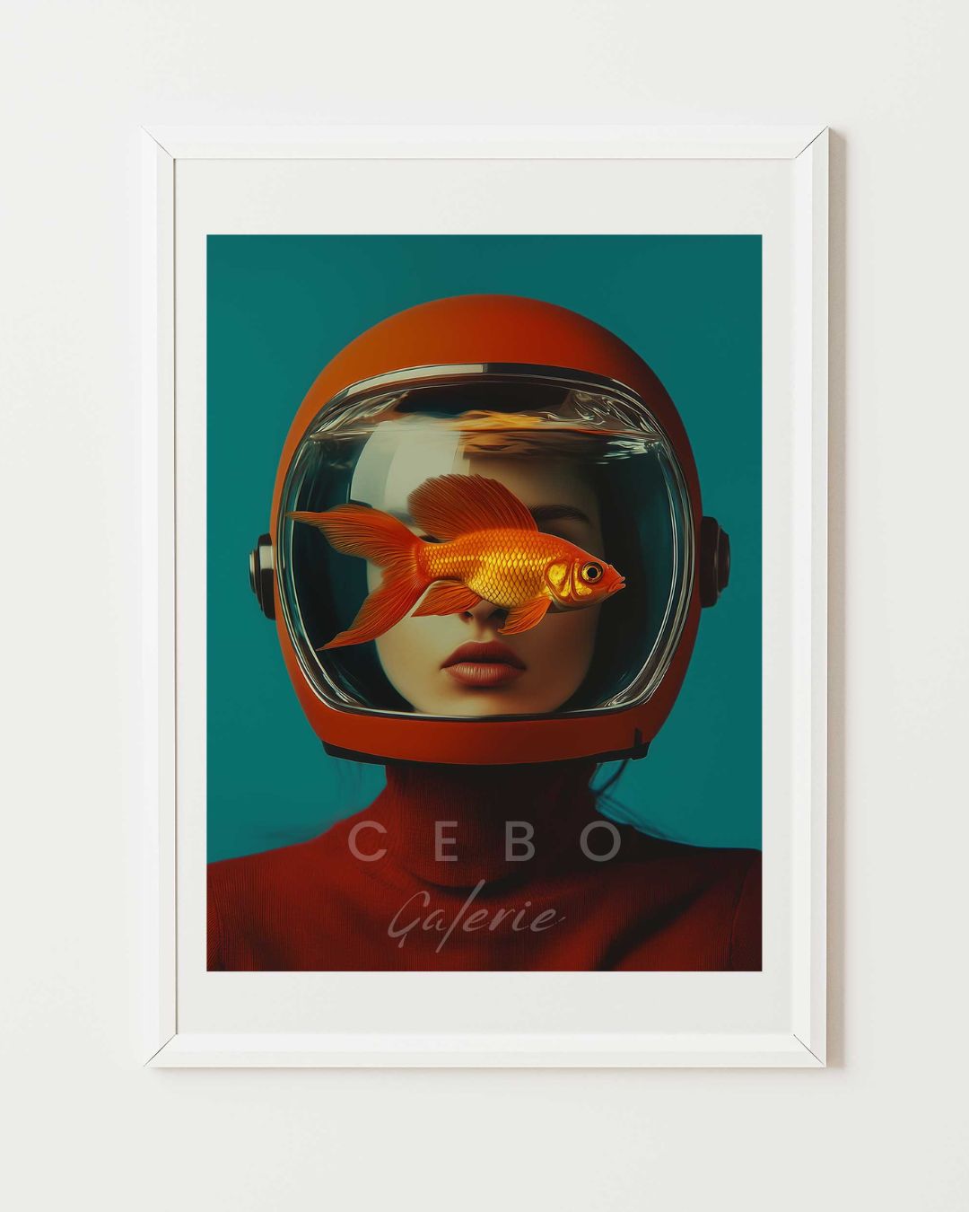 Affiche d'Art 'Amazone Aquatique', une création audacieuse et poétique qui explore la féminité sous un angle résolument surréaliste. Le visage d’une femme, calme et impassible, est ici enfermé dans un casque spatial aux lignes rétro, devenu aquarium pour un poisson rouge flamboyant.