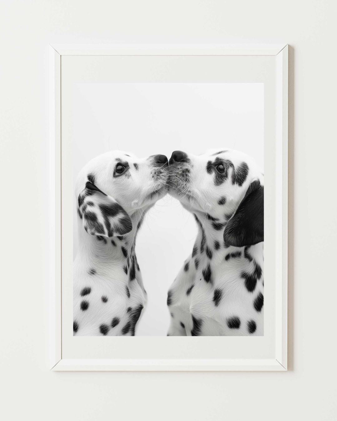 Affiche d'Art 'Amour à Taches', plongez dans un instant de tendresse et d'innocence avec notre affiche d'art, capturant deux adorables chiots dalmatiens dans un échange passionné. Sur un fond blanc éclatant, les taches distinctives de cette race emblématique créent un contraste saisissant, mettant en valeur leur étreinte affectueuse. Cette œuvre est bien plus qu'une simple photo : elle célèbre l'amour inconditionnel et la beauté de nos compagnons à quatre pattes. Ajoutez une touche de charme et d'élégance à votre intérieur avec cette affiche minimaliste et intemporelle, qui s'harmonisera parfaitement avec tous les styles de décoration..