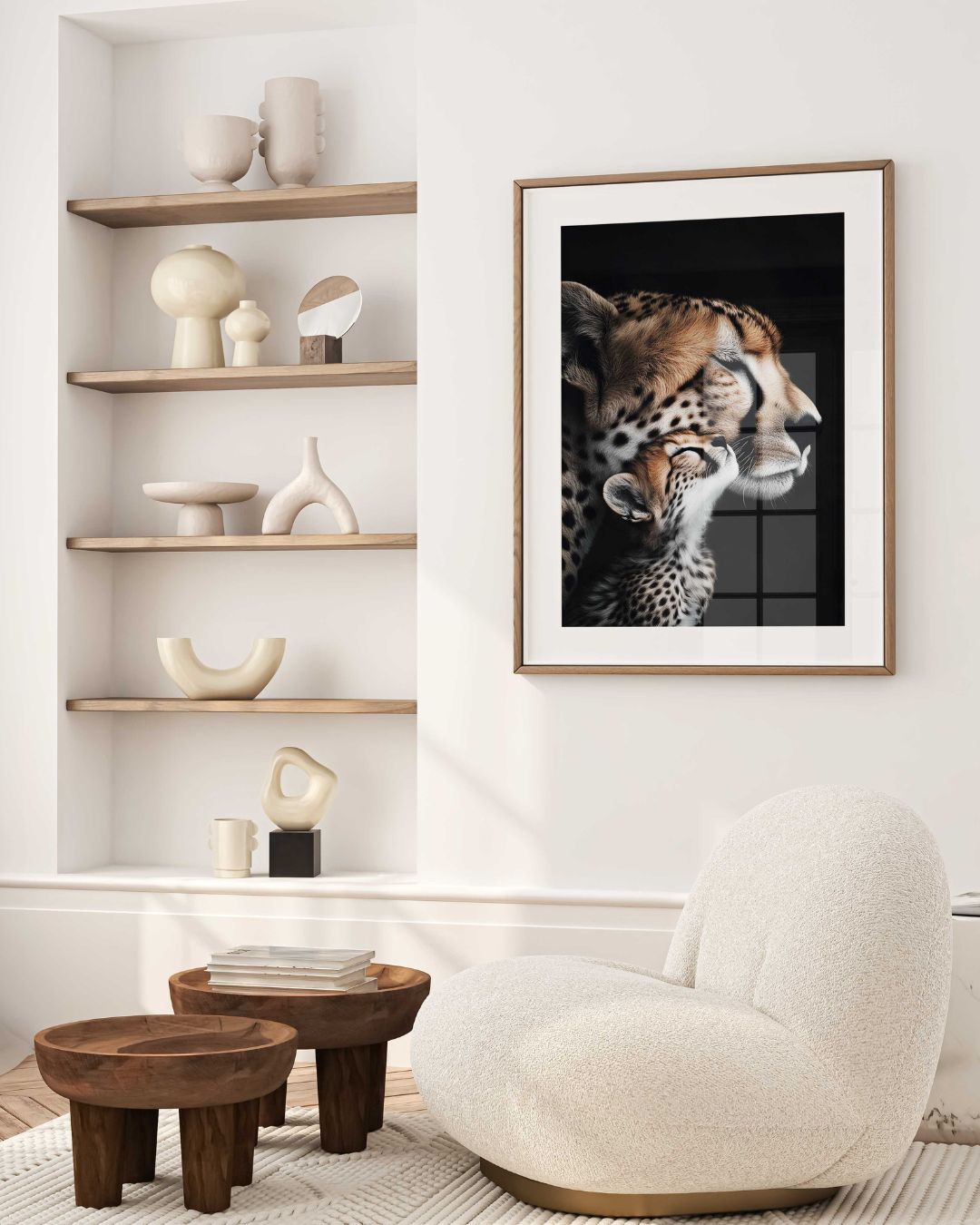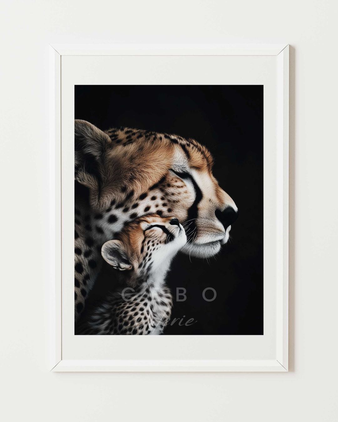 Affiche d'Art 'Amour Maternel', une œuvre d’art conceptuelle et minimaliste qui capture avec élégance et sensibilité la tendresse d’une maman guépard câlinant son petit. Le fond noir profond met en valeur ce moment intime et intemporel, créant un contraste saisissant qui attire immédiatement l’œil et évoque une connexion émotionnelle universelle. Chaque détail de ce duo Mère-enfant est soigneusement mis en lumière, soulignant la puissance de l’instinct maternel et l’amour inconditionnel qui transcendent les espèces.