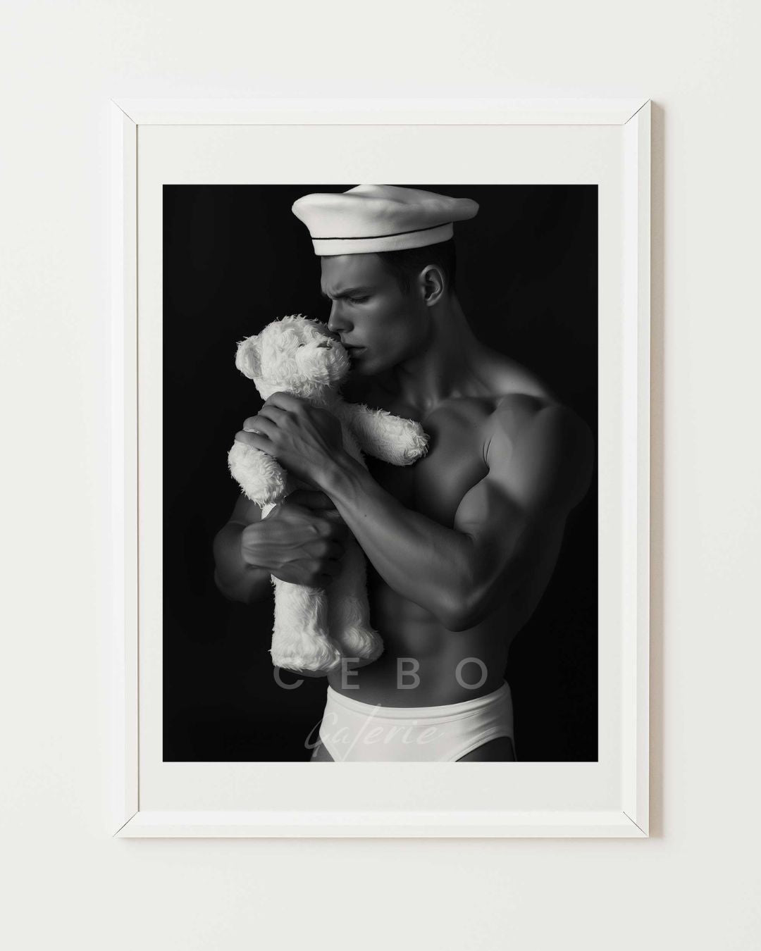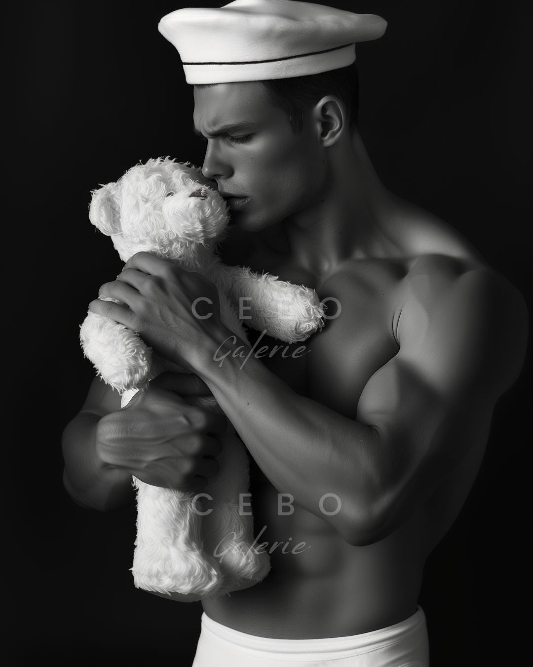 Affiche d'Art 'Big Boys Do Cry', décrouvrez une affiche d’art puissante et émouvante qui explore la vulnérabilité masculine à travers un portrait saisissant en noir et blanc. Cette œuvre représente un marin musclé, exprimant une tristesse profonde, tenant délicatement un ours en peluche blanc. Son chapeau de marin blanc et son slip simple contrastent avec l’arrière-plan sombre, attirant toute l’attention sur son expression émotive et la tendresse de son geste.