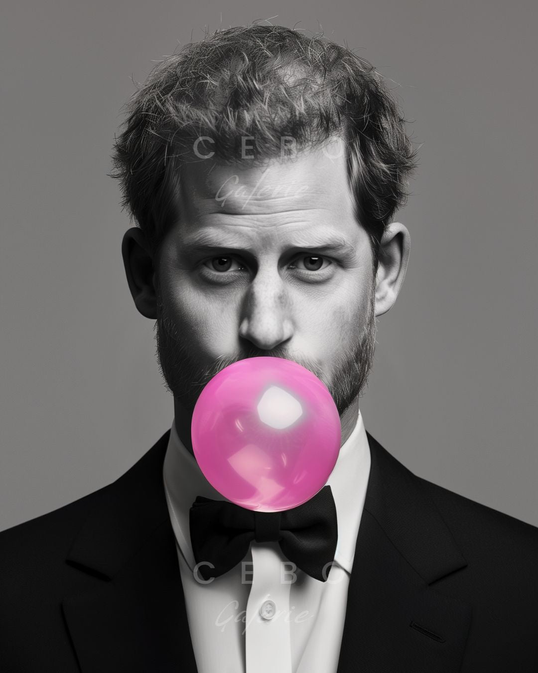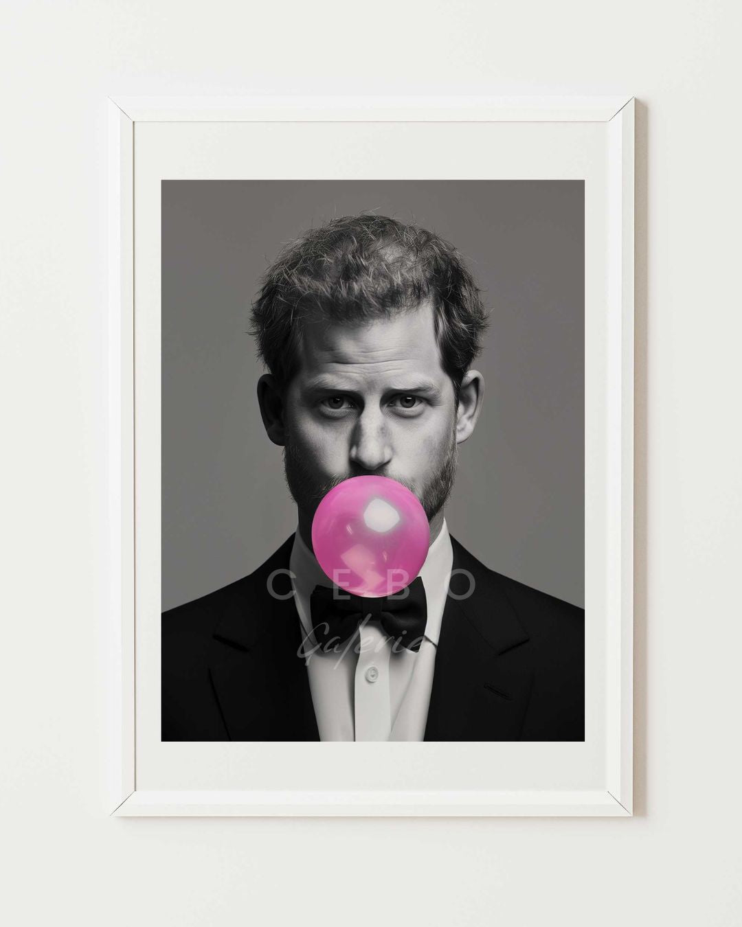 Affiche d'Art 'Bulles d'Harry', cette création artistique audacieuse capte l’essence du prince Harry de Sussex, connu pour son esprit rebelle et son affranchissement des règles strictes de la monarchie britannique. Photographié en noir et blanc, Harry apparaît en train de souffler une bulle de chewing-gum rose, introduisant une légèreté inattendue qui contraste avec son image de prince.
