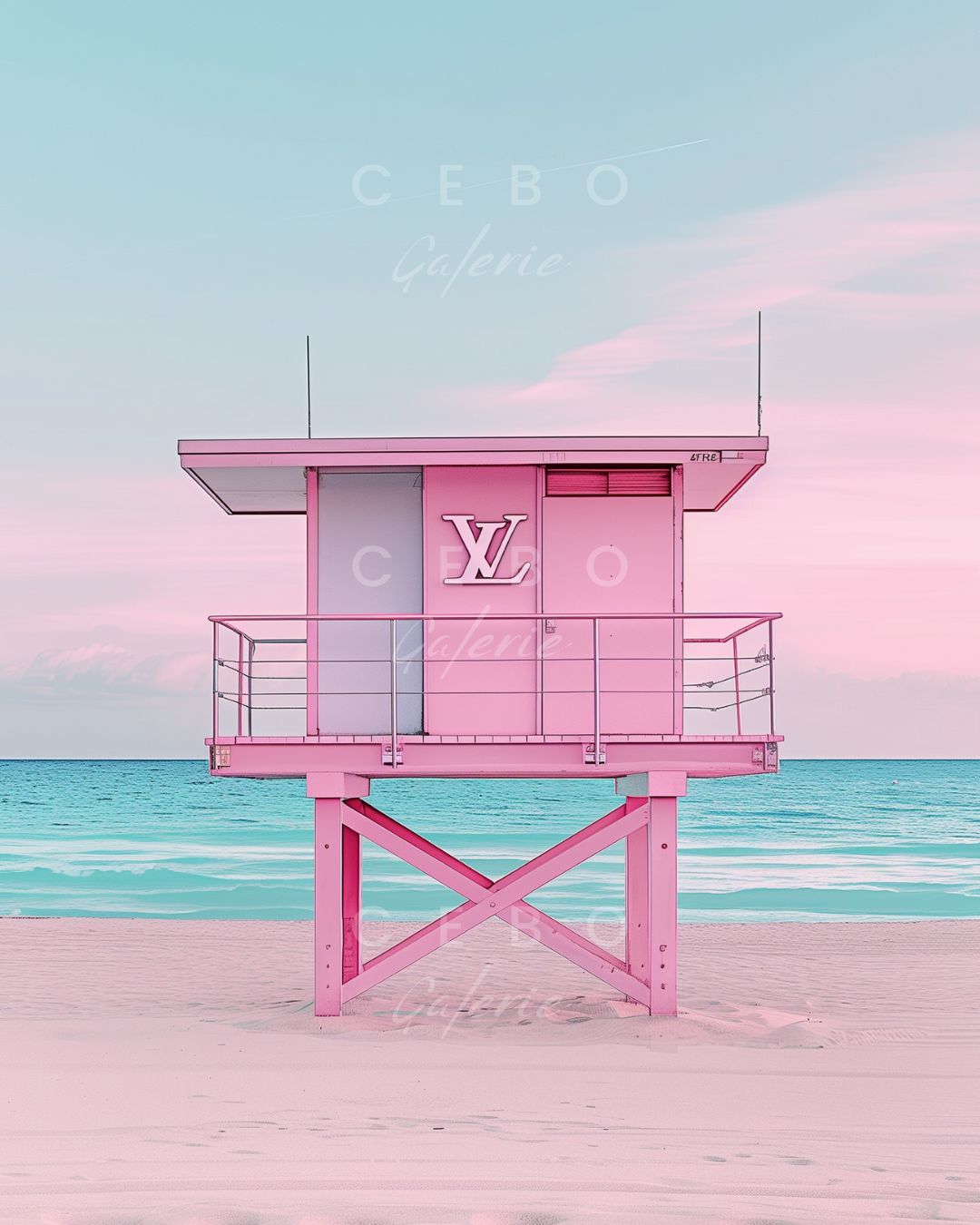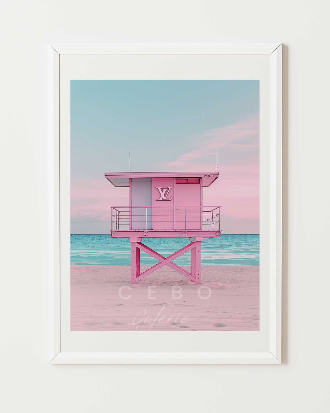 Affiche d'Art 'Cabane de Luxe', une affiche d’art captivante qui fusionne élégamment l’évasion et le raffinement de la haute couture française. Cette œuvre minimaliste présente une cabane de plage rose, ornée d’un logo évoquant une célèbre marque de luxe française, placée audacieusement au centre de la composition.