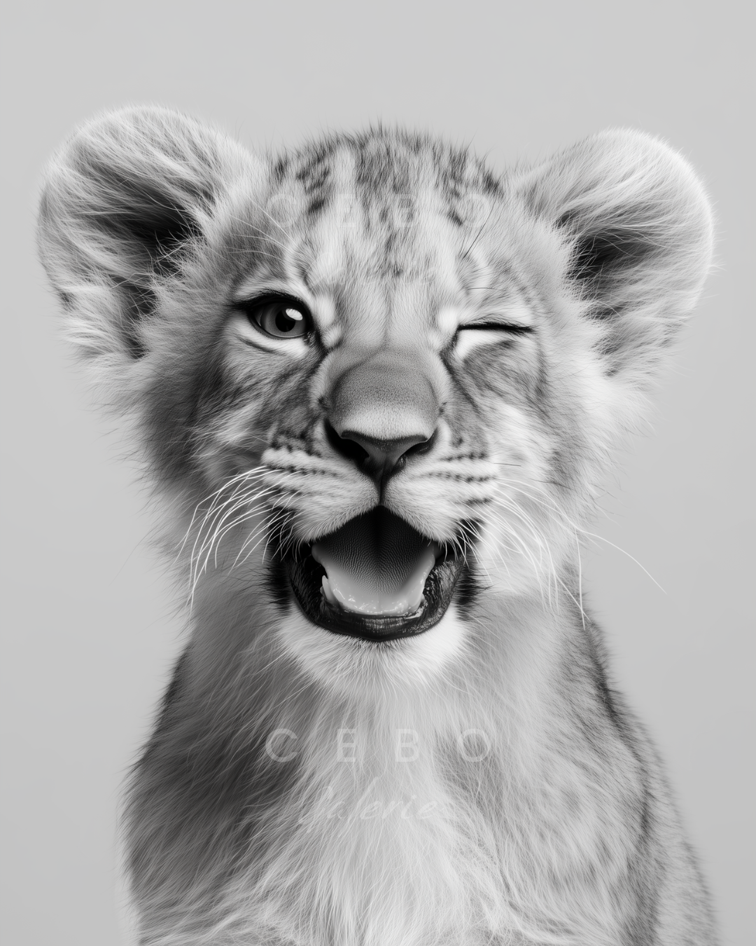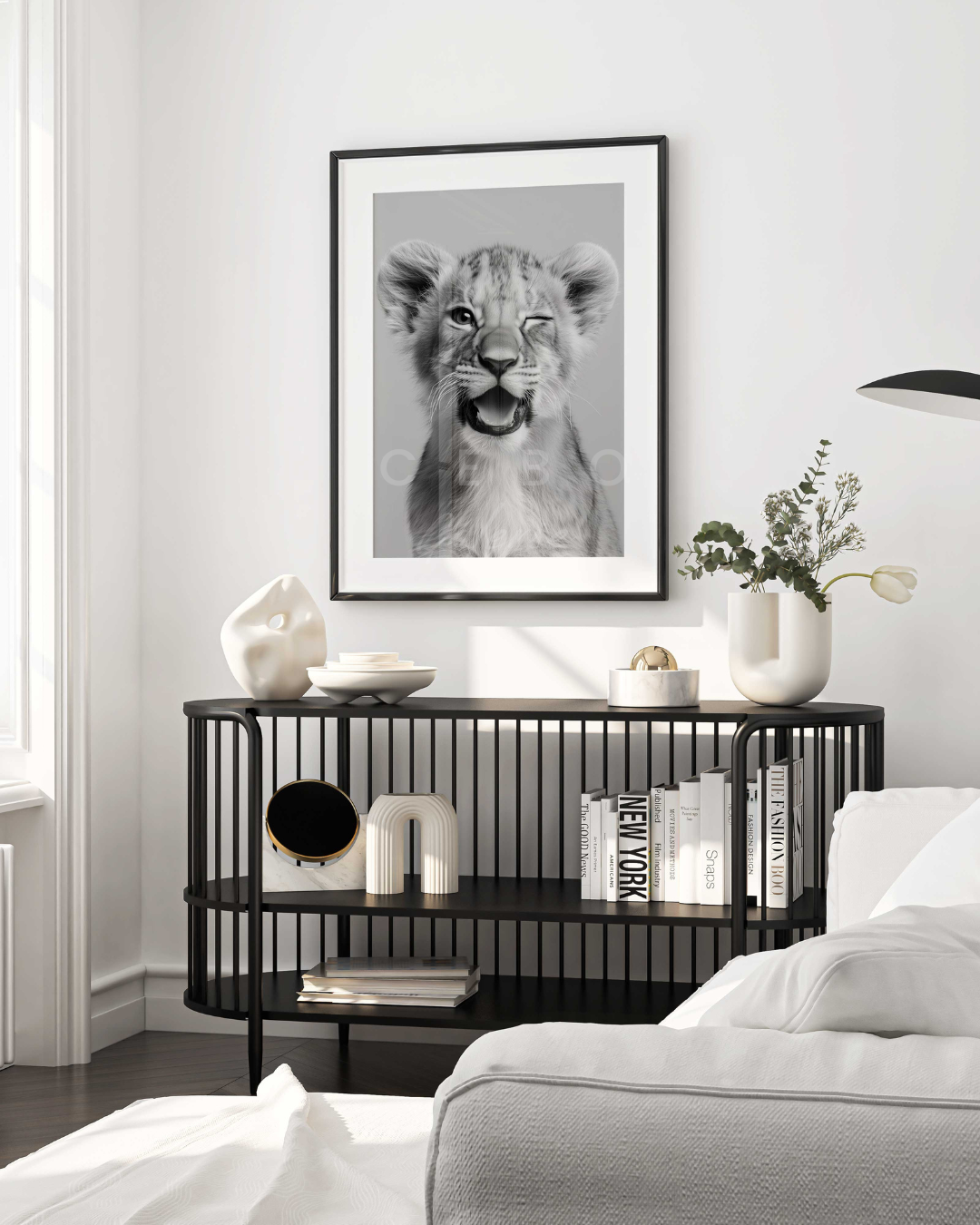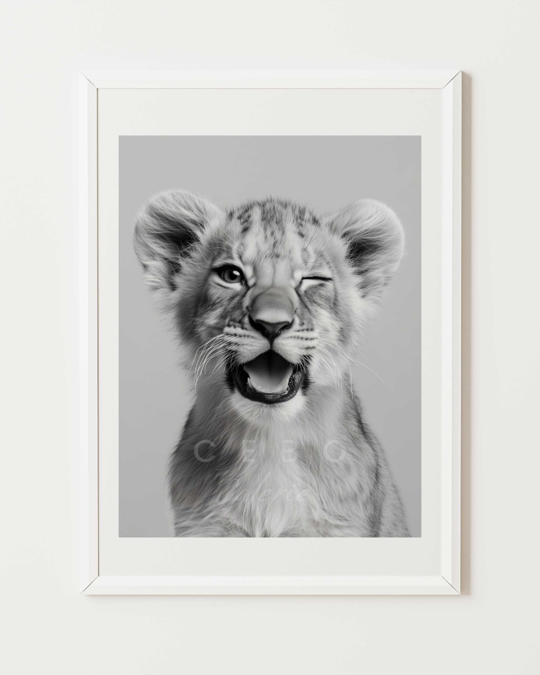 L’affiche “Clin d’Œil Félin” capture un lionceau attendrissant dans une posture pleine de caractère, entre candeur et assurance. Le noir et blanc met en valeur chaque détail de son pelage et l’expression vive de son regard, pour un rendu aussi élégant qu’attachant.