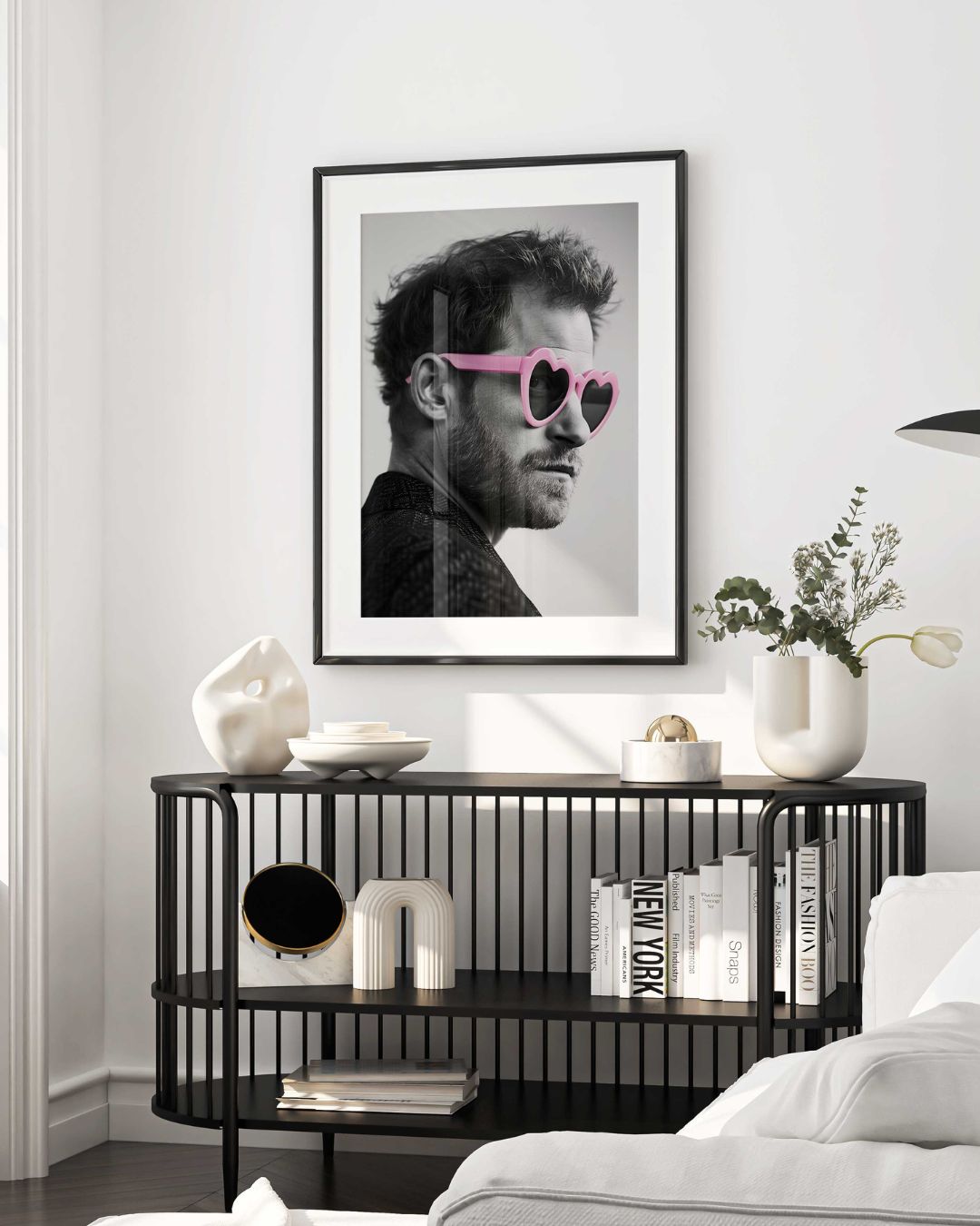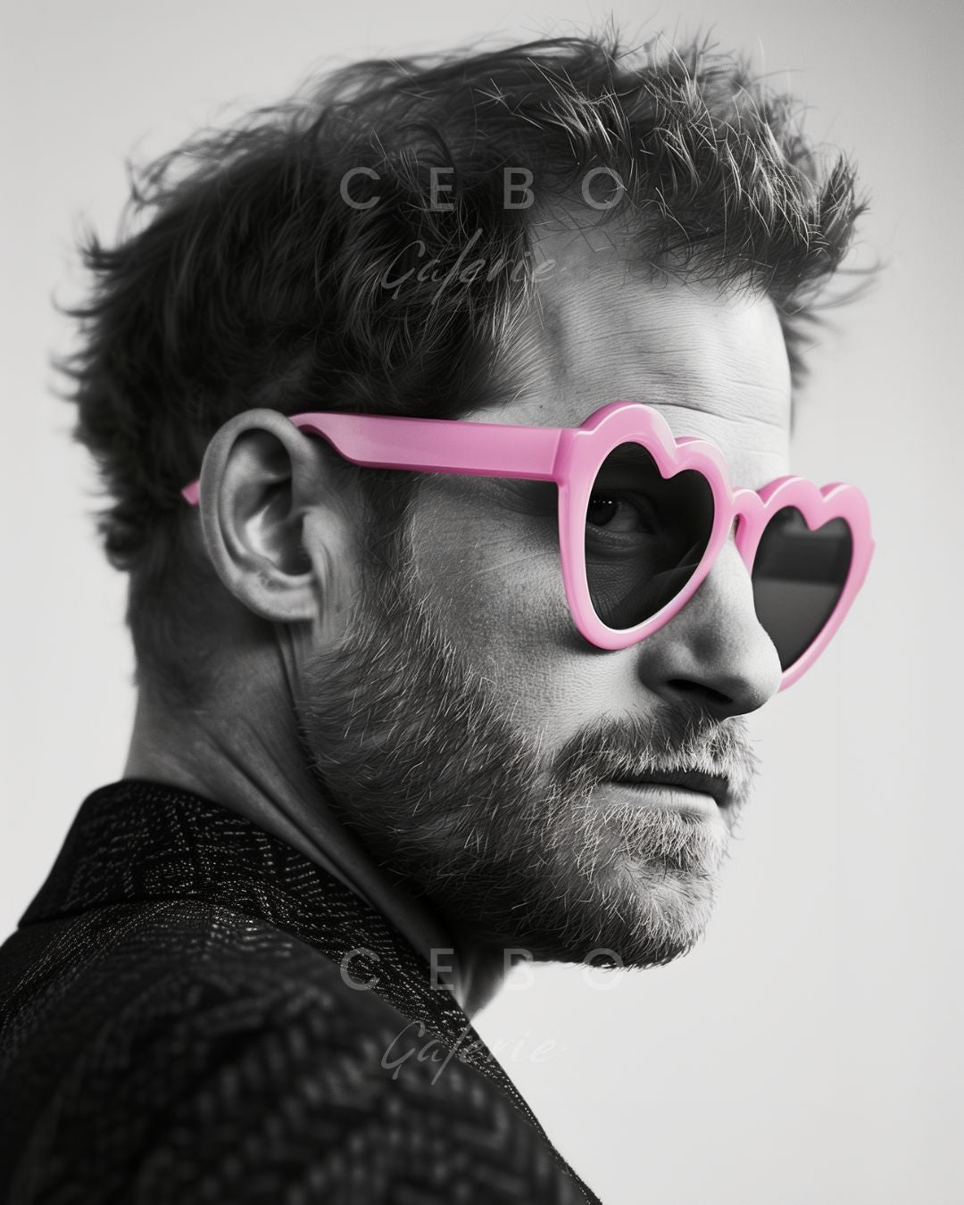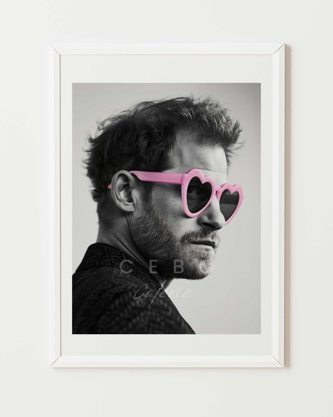 Affiche d'Art ' Coeur d'Harry', une œuvre artistique minimaliste et captivante qui réinvente l’image du prince Harry sous un angle surprenant et moderne. Cette affiche en noir et blanc capture le duc de Sussex arborant des lunettes en forme de cœur avec une monture épaisse rose et des verres noirs, tout en portant une tenue élégante, inspirée du style emblématique qu’il affiche lors de ses apparitions publiques. Le fond gris clair met en lumière cette figure royale tout en rompant avec les conventions traditionnelles.