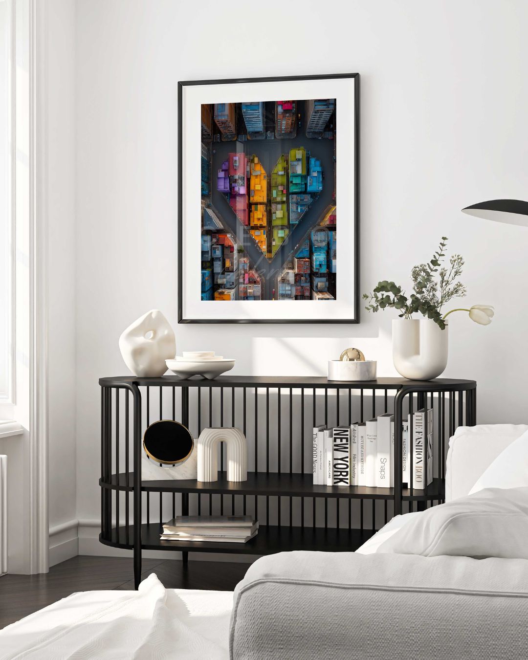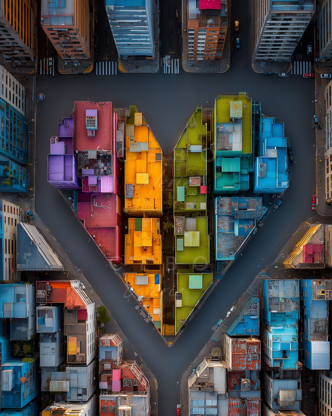 Affiche d'Art 'Cœur Urbain', une affiche d’art aérienne et vibrante qui transforme le chaos de la ville en une déclaration d’amour graphique. Capturée depuis les airs, cette composition unique révèle un quartier où les toits colorés dessinent un cœur parfait au centre des rues. Une vision poétique qui sublime l’architecture et nous rappelle que la beauté peut se cacher là où on l’attend le moins.