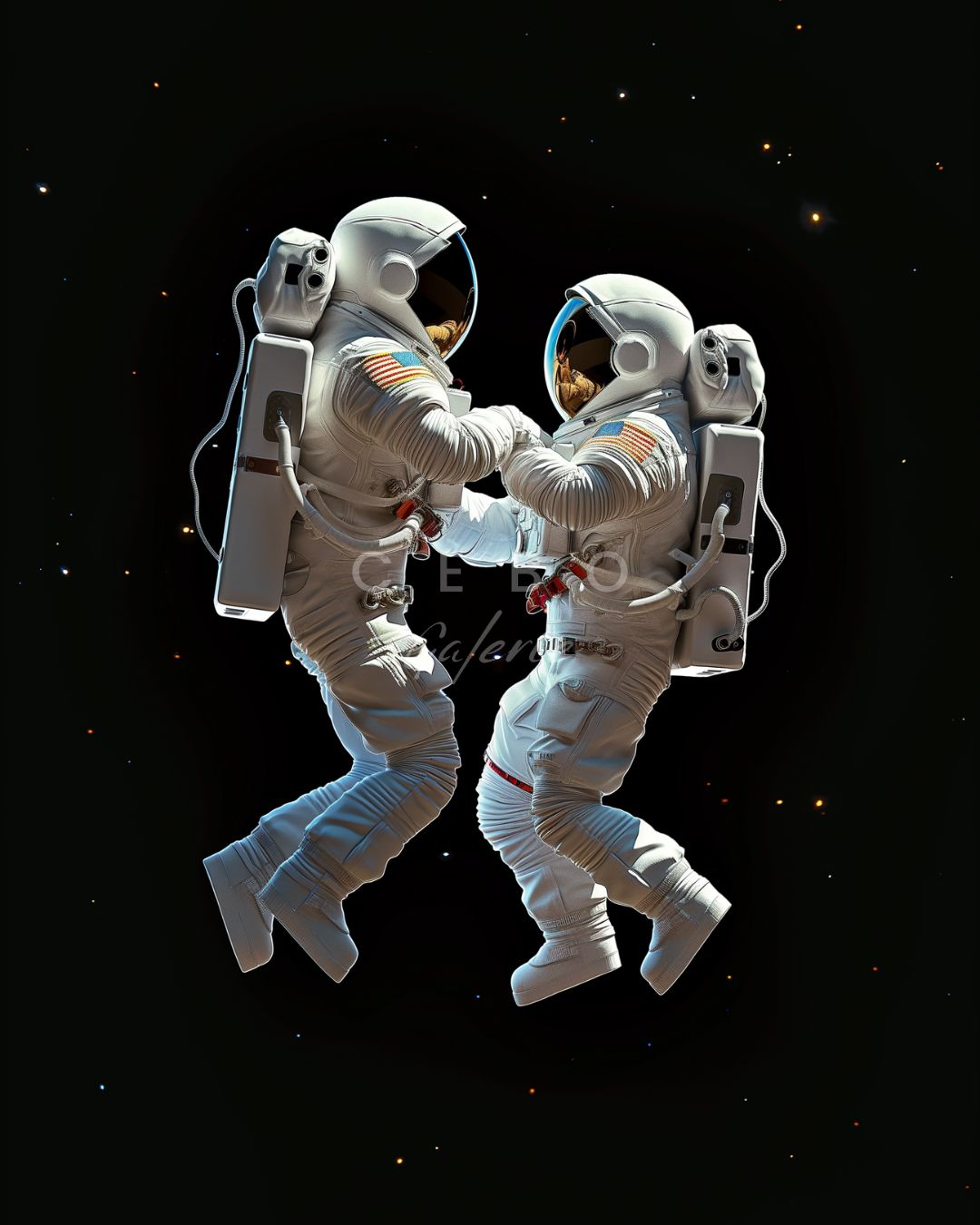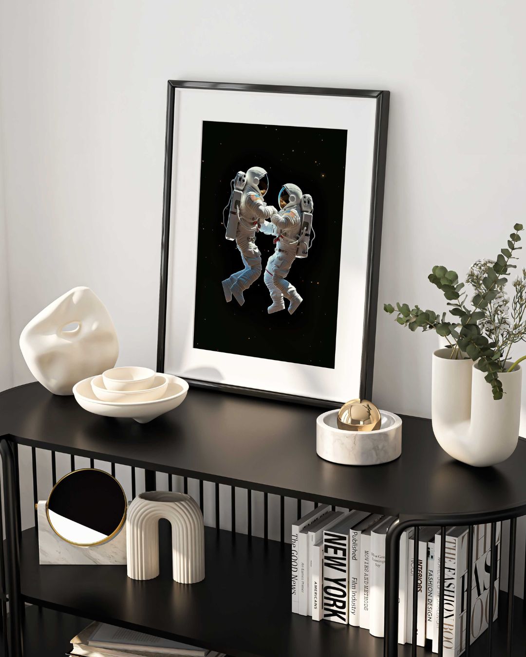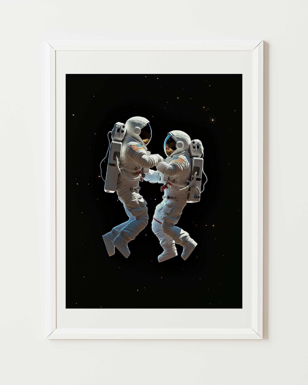 Affiche d'Art 'Danse avec les Stars', plongez dans l'univers mystérieux de l'espace avec notre affiche d'Art. Deux astronautes, enveloppés dans leurs tenues blanches, semblent s'adonner à une danse gracieuse parmi les étoiles scintillantes de l'univers infini. Le contraste saisissant entre le blanc éclatant de leurs combinaisons et le noir profond de l'espace crée une esthétique visuelle captivante qui attire immédiatement le regard. Cette œuvre audacieuse et conceptuelle est une invitation à explorer les frontières de notre curiosité et de notre imagination. Accrochez cette affiche dans votre espace de vie pour ajouter une touche d'émerveillement et de mystère, et laissez-vous transporter vers les confins de l'inconnu.
