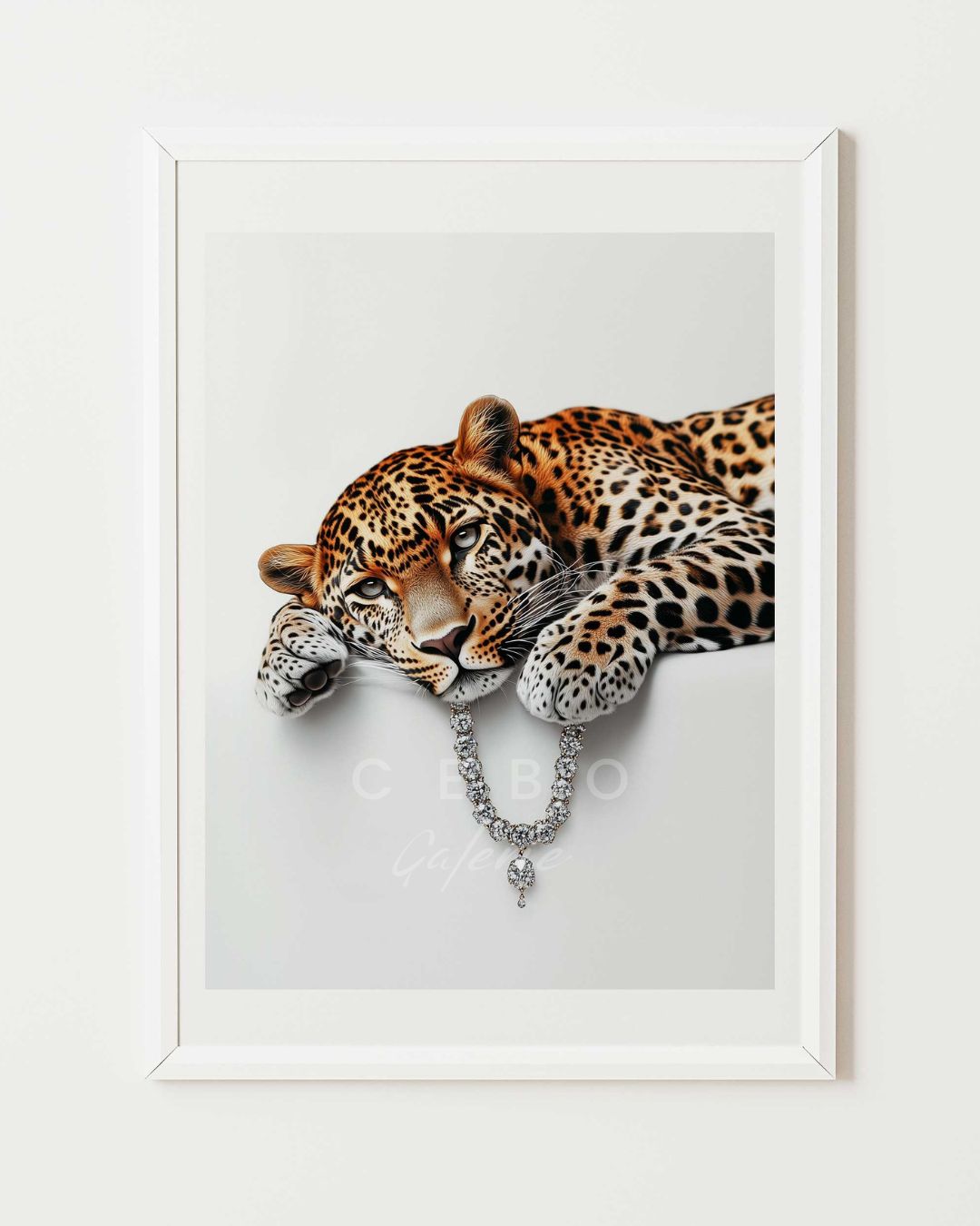 Affiche d'Art 'Diamonds of the Tiger', une affiche d’art conceptuelle et minimaliste qui réinvente la majesté animale avec une touche de luxe. Ce portrait saisissant met en scène un tigre allongé sur un fond blanc épuré, tenant délicatement un somptueux collier de diamants entre ses pattes. Son regard perçant, empli de puissance et de douceur, semble protéger ce précieux bijou comme un trésor inestimable.