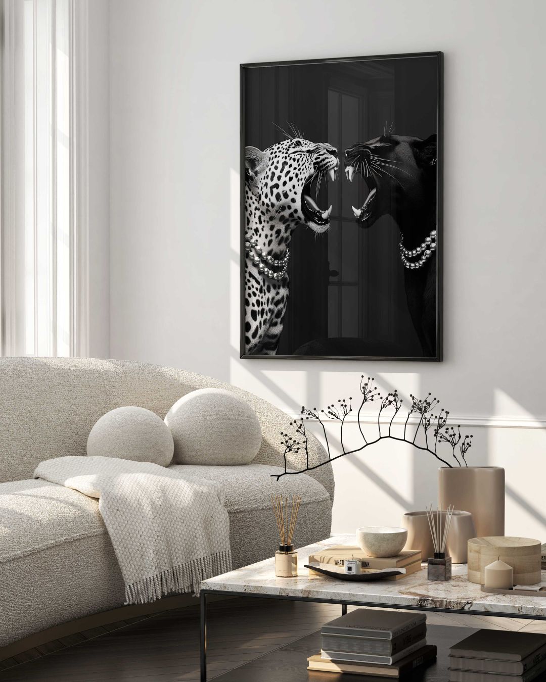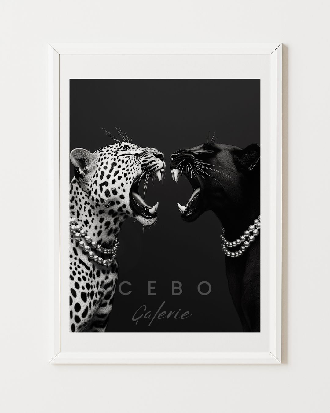 Affiche d'Art 'Duel Sauvage', une création conceptuelle et minimaliste en noir et blanc qui capture un face-à-face captivant entre une panthère noire et un jaguar. Ces deux félins majestueux, gueules ouvertes comme pour rugir, semblent engagés dans un affrontement symbolique, chacun portant un élégant collier de perles, ajoutant une touche inattendue de raffinement à cette scène sauvage.