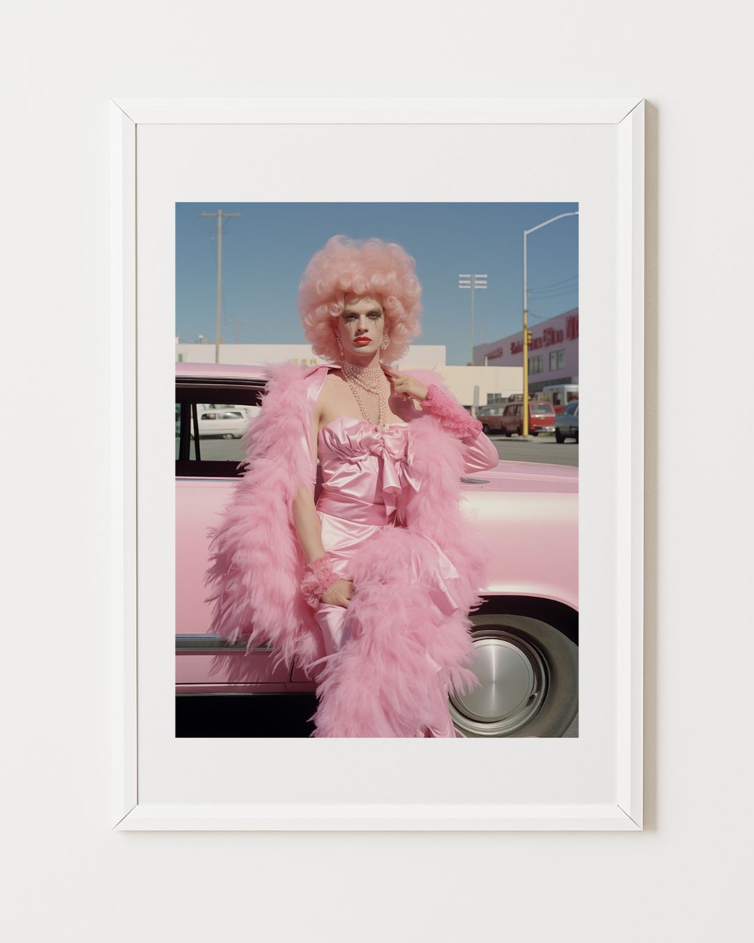 Affiche d'Art 'Éclat de Diva', cette affiche incarne l'essence audacieuse de l'art du Drag, capturant une drag queen vêtue d'une somptueuse robe rose, posant avec assurance devant une voiture ancienne rose sur un parking américain.