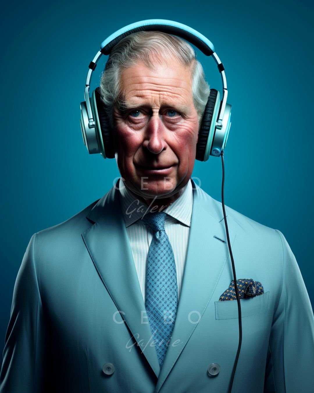 Affiche d'Art 'Hommage to the King', une création emblématique de Cebo Galerie qui fusionne minimalisme contemporain et signification profonde. Cette œuvre saisissante met en scène Sa Majesté le Roi Charles III, capturé dans un moment intime d’écoute musicale avec des écouteurs bleus, assortis à sa tenue et sur un fond bleu harmonieux. L’emploi judicieux du bleu non seulement souligne l’élégance royale, mais évoque également son dévouement à l’écologie et son respect pour l’héritage de la Reine Élisabeth.
