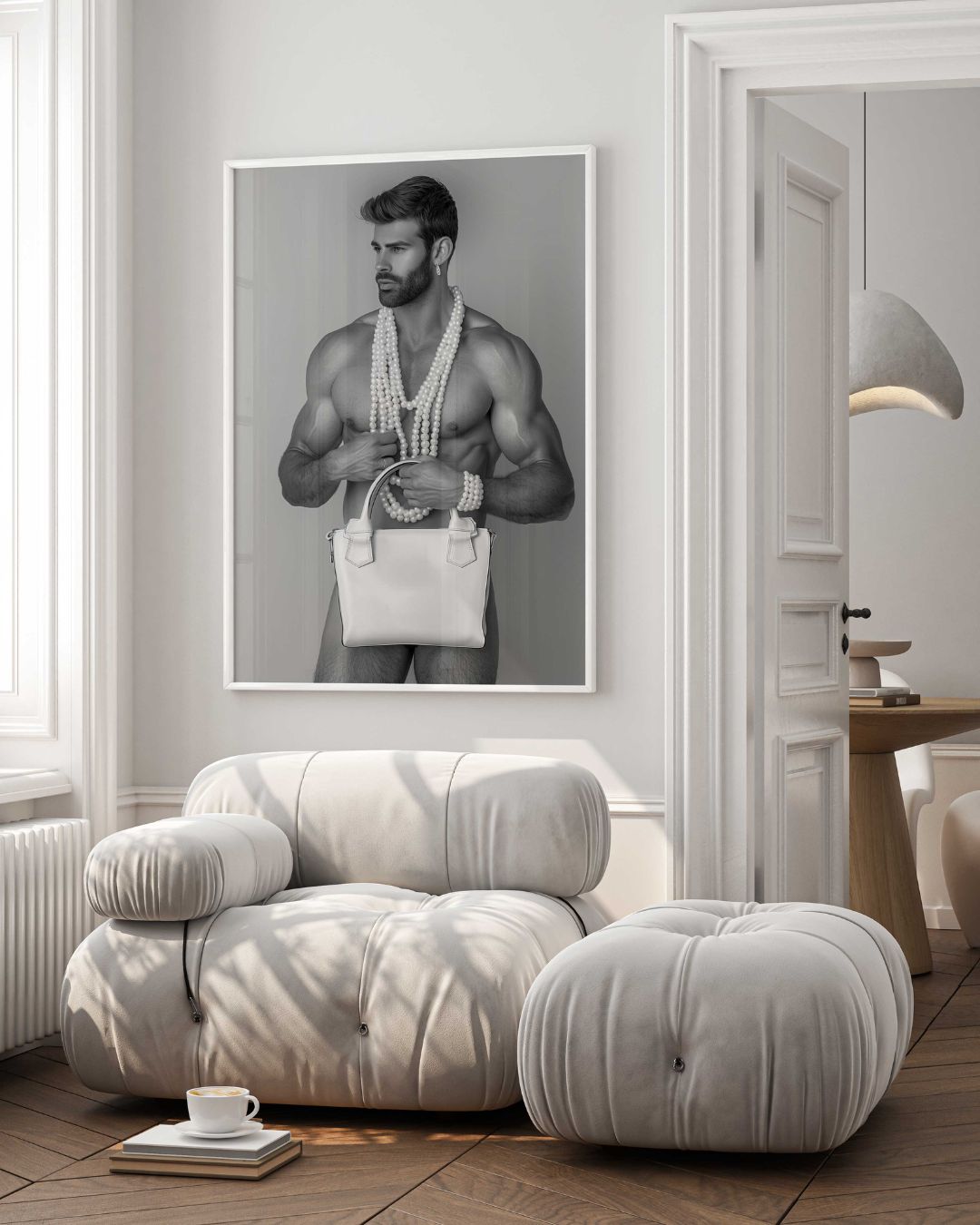 Cette affiche captivante présente un portrait élégant d’un homme musclé et séduisant, orné de perles et tenant un sac à main blanc de luxe. Il porte également des boucles d’oreilles raffinées, créant un contraste saisissant entre sa physionomie robuste et les accessoires traditionnellement féminins.