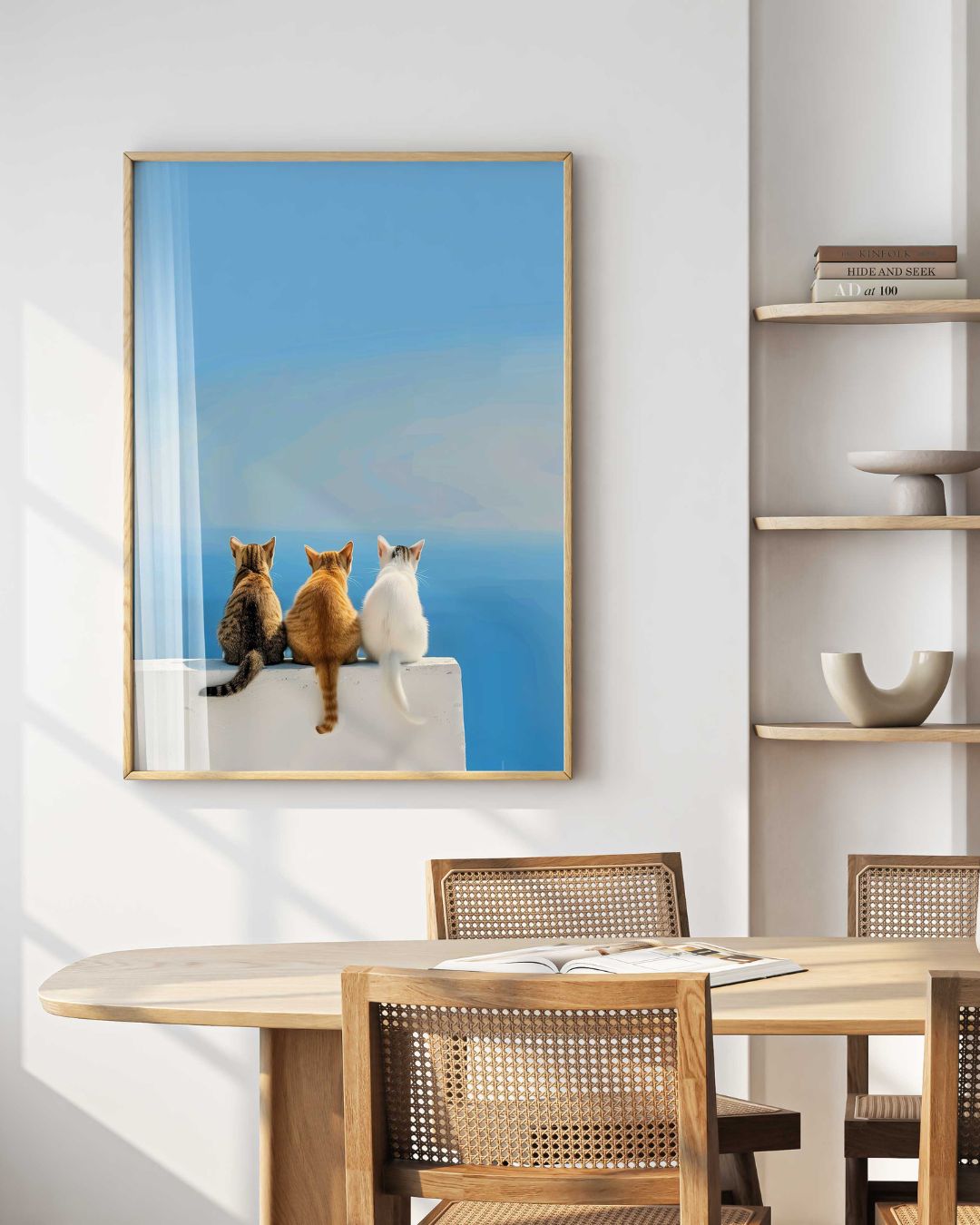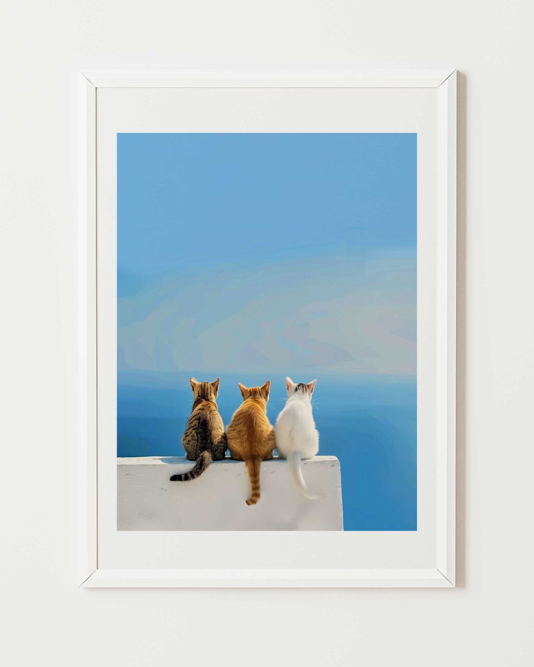 Le fond bleu intense et le mur blanc épuré mettent en relief les silhouettes des chats, faisant de cette image une véritable fenêtre ouverte sur leur monde secret. Le style minimaliste et les couleurs vives capturent l’attention et évoquent la tranquillité des paysages grecs, faisant de cette affiche un ajout idéal pour tout espace désirant une touche de douceur et d’évasion.