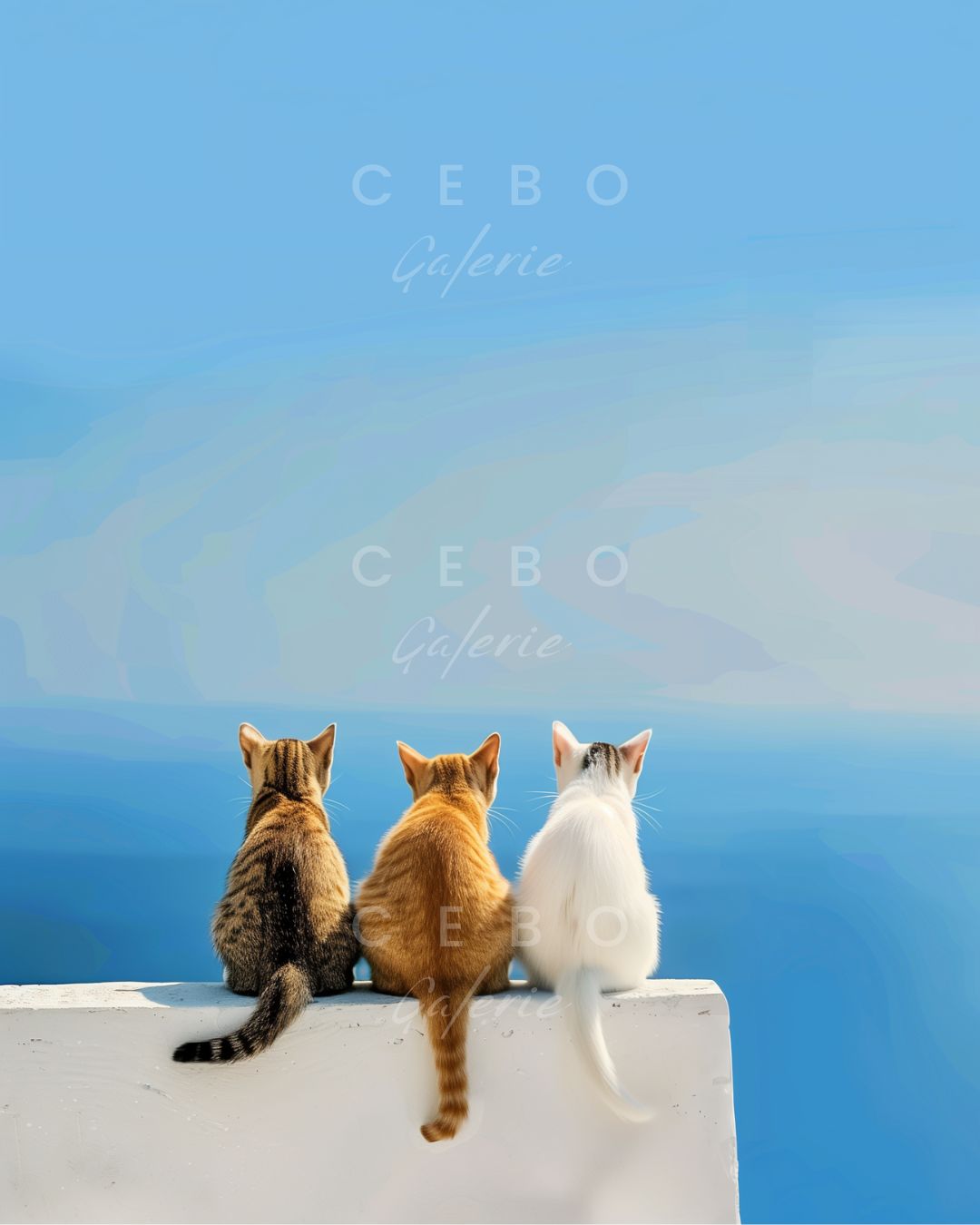 Affiche d'Art 'Les Commères', plongez dans le charmant monde de notre nouvelle affiche exclusive qui capture l’essence pittoresque de la vie féline sur une île grecque. Cette œuvre d’art met en scène trois chats adorables, assis sur un mur blanc, en pleine “discussion”. Ils semblent raconter les petites aventures du village, offrant un aperçu amusant et attendrissant de leurs interactions.