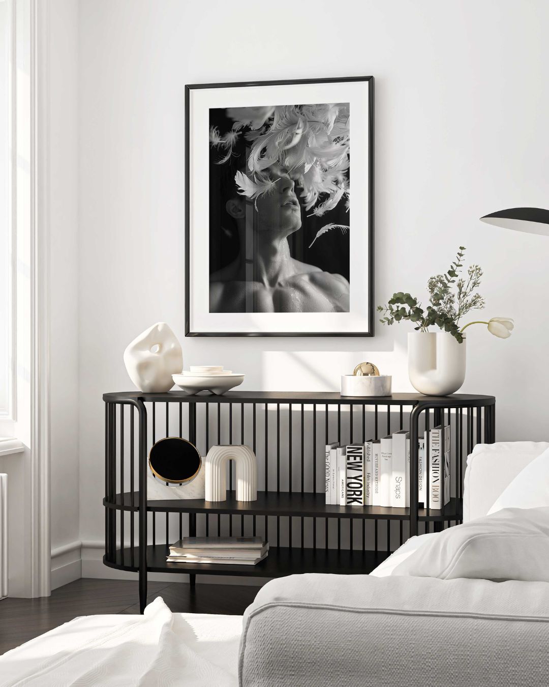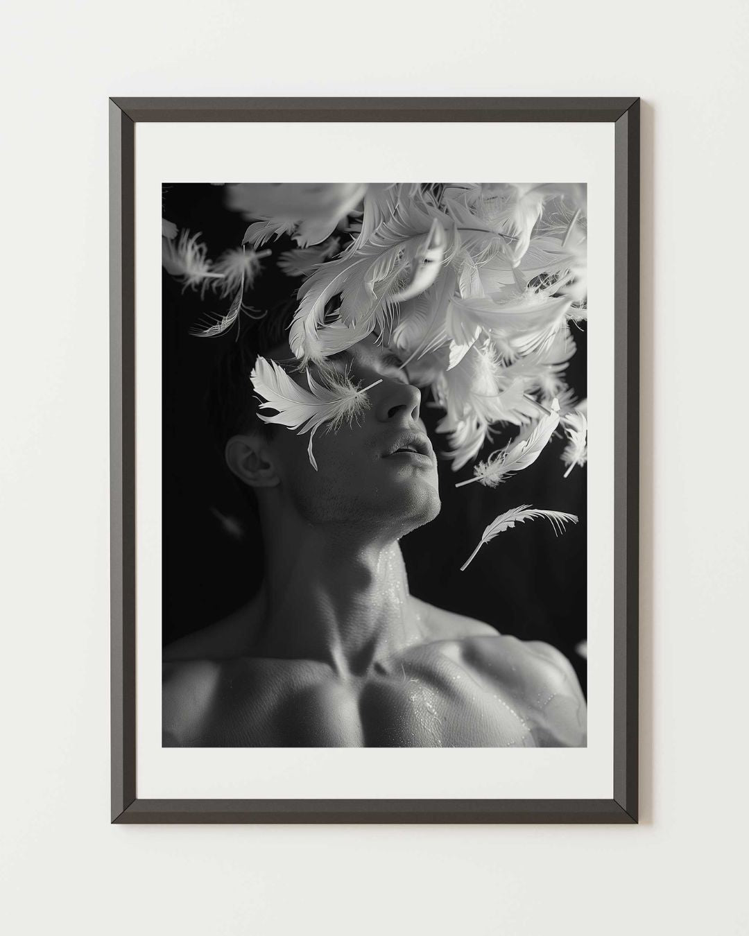 Affiche d'Art 'Masculinité en Suspension'. Dans cette photo conceptuelle en noir et blanc, un jeune homme à la musculature impressionnante émerge de l'obscurité, son torse nu révélant une silhouette à la fois puissante et mystérieuse. Des plumes blanches cascades sur une partie de son visage, ajoutant une touche de mystère et de sensualité à l'image. Les fines gouttes d'eau qui traversent son corps évoquent une ambiance à la fois érotique et envoûtante. Pour accentuer l'impact visuel de cette œuvre, nous vous recommandons de l'encadrer dans un cadre blanc ou noir élégant, créant ainsi un contraste saisissant et mettant en valeur chaque détail de cette composition unique.