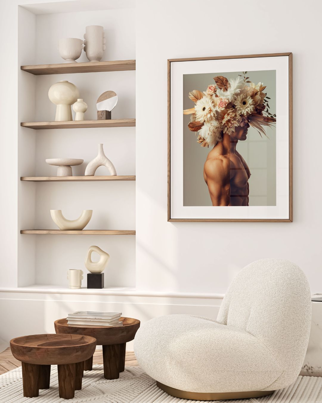 Capturée dans un style minimaliste, cette œuvre met en scène un homme musclé, son visage artistiquement masqué par un luxuriant bouquet de fleurs et de plumes. Le contraste saisissant entre sa silhouette robuste et la délicatesse des fleurs interpelle et célèbre une vision moderne de la masculinité.
