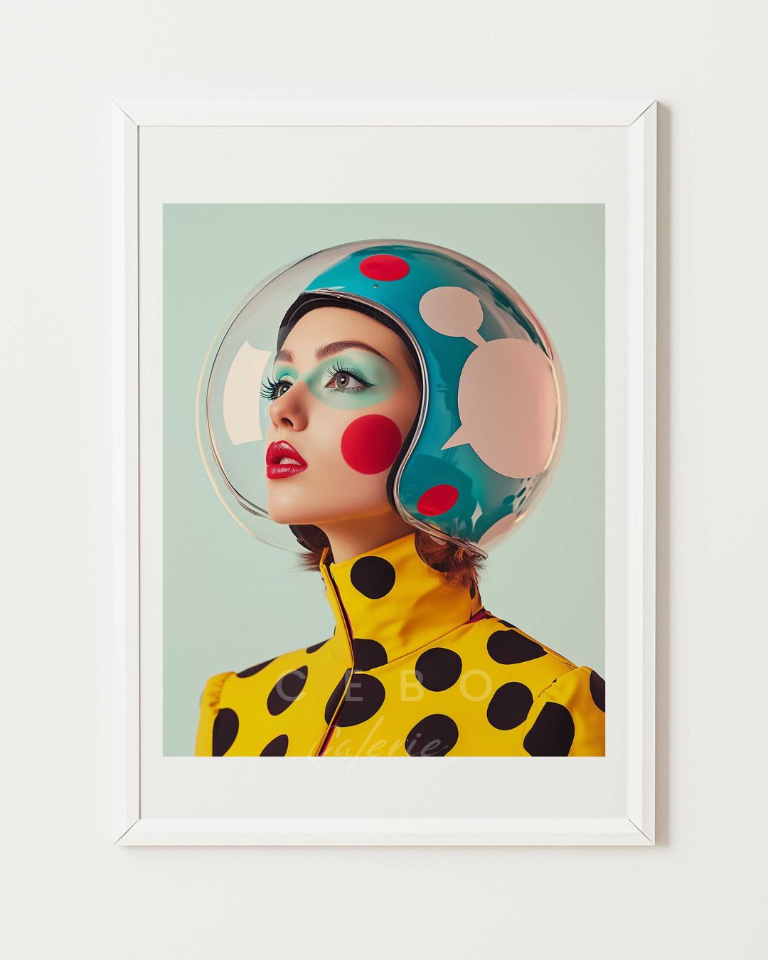 Affiche d'Art 'Miss Fabulous', une affiche d’art minimaliste qui célèbre la féminité sous un angle audacieux et inattendu. Cette œuvre captivante met en scène une femme énigmatique portant un casque bleu et une tenue jaune éclatante, parsemés de gros points ronds multicolores, comme une explosion de créativité et de singularité.