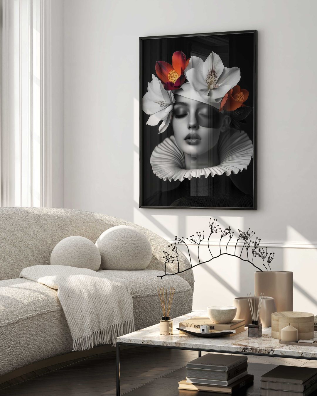 Affiche d'Art 'Moderne Colombine', une affiche d’art conceptuelle et minimaliste qui revisite le personnage emblématique de la commedia dell’arte avec une touche contemporaine. Arborant un col majestueux et une composition florale vibrante, cette figure mystérieuse aux yeux clos incarne un équilibre fascinant entre théâtralité et douceur. Son masque noir asymétrique renforce l’ambiguïté de son identité, entre ombre et lumière, rêve et réalité.
