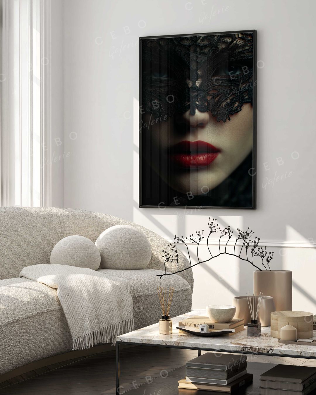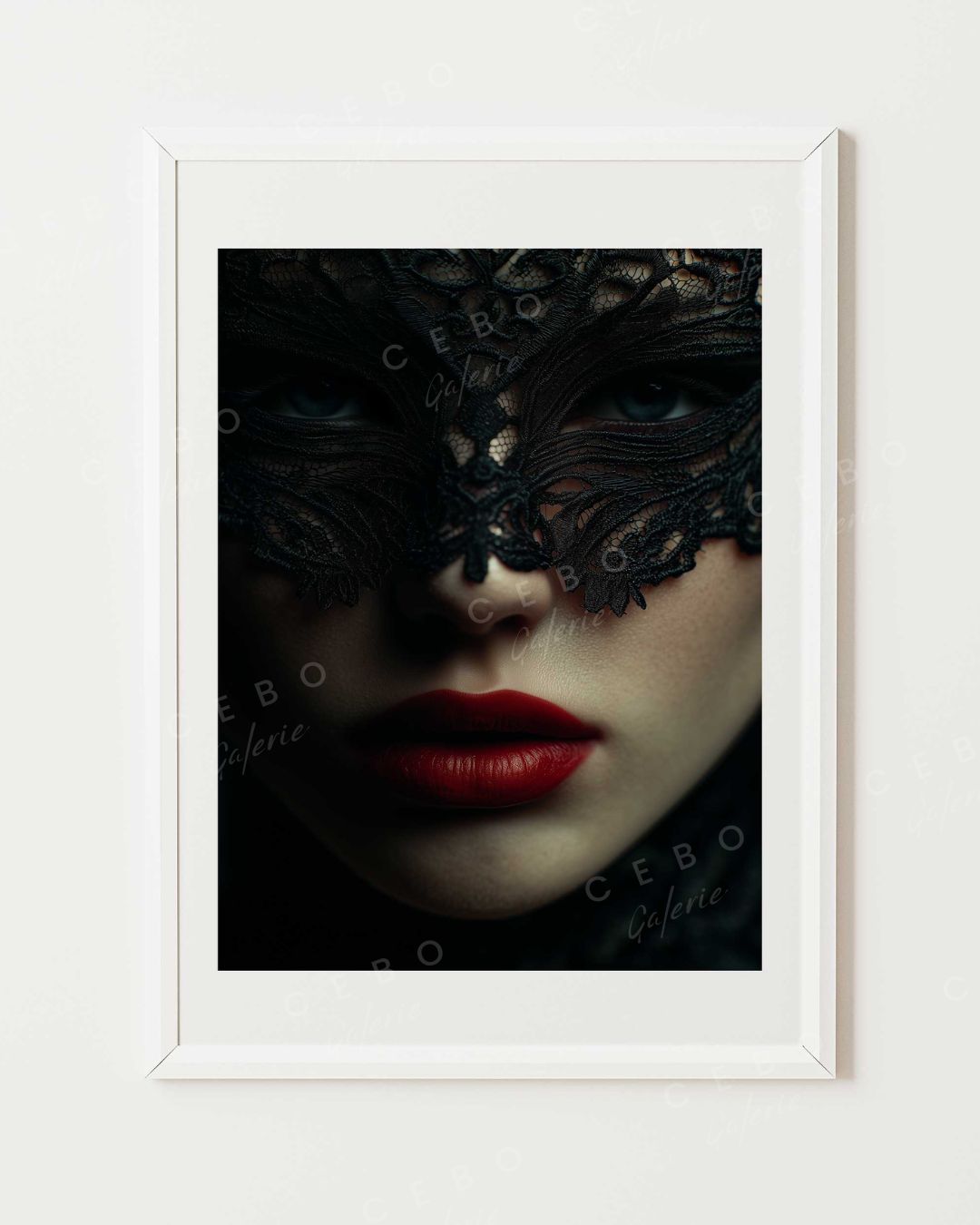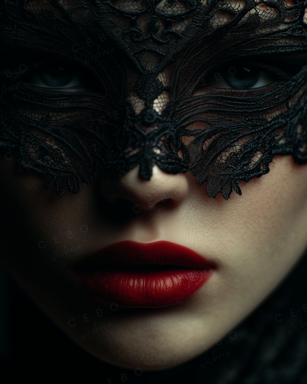“Mystère Carmin” capture un visage féminin en gros plan, à la fois sensuel et insaisissable. Derrière un masque de dentelle noire finement ouvragé, les yeux se devinent dans l’ombre, tandis que des lèvres carmin parfaitement dessinées deviennent le point focal de la composition.