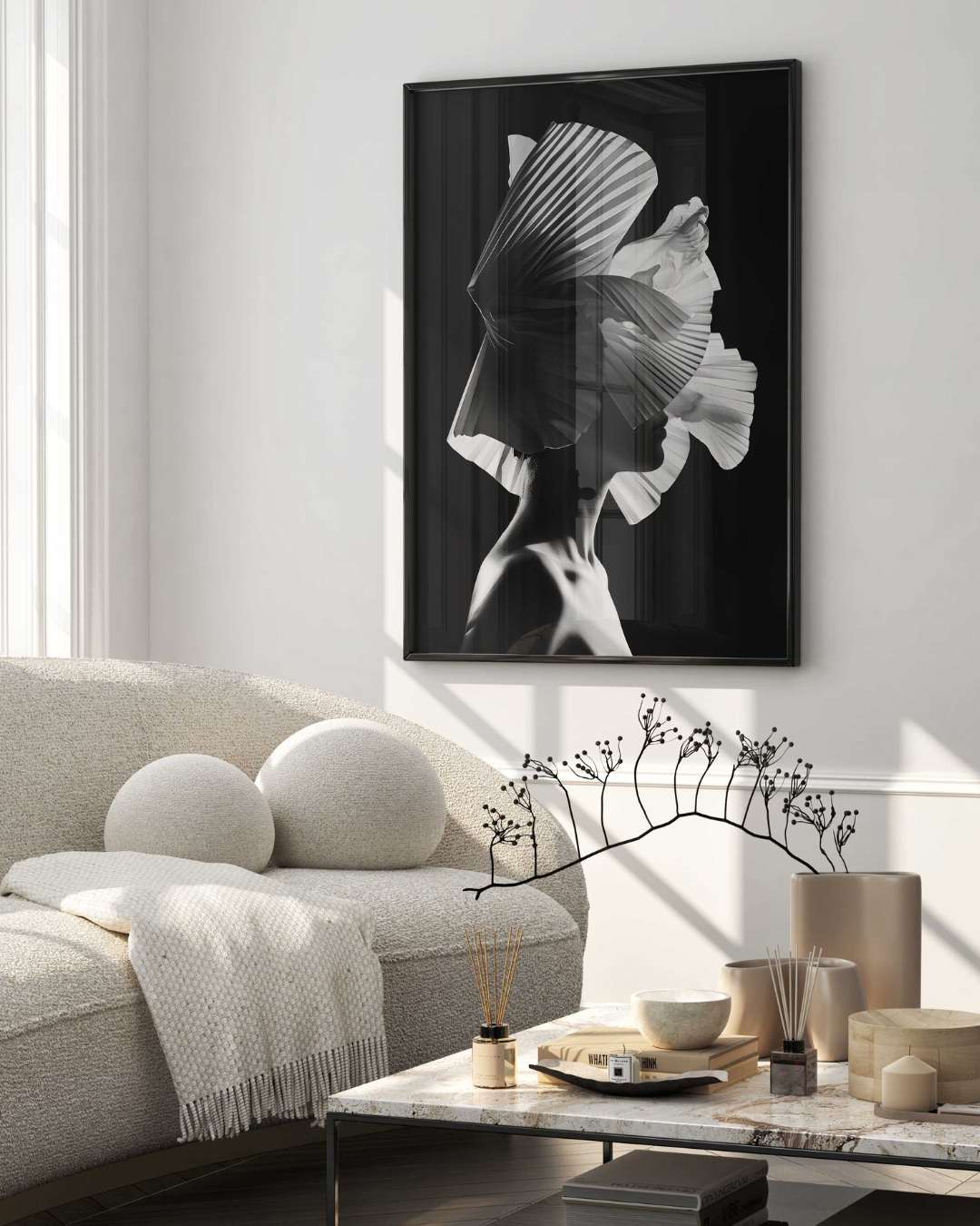 Affiche d'Art 'Mystère Envolé', découvrez une affiche d'art captivante en noir et blanc. Une femme mystérieuse est mise en avant, son visage partiellement dissimulé par un voile de tissu flottant. Cette composition en trois dimensions crée une dynamique unique, évoquant une aura de mystère et d'élégance. L'esthétique minimaliste et le contraste saisissant du noir et blanc ajoutent une touche sophistiquée à tout intérieur. Plongez dans l'univers du mystère et de la féminité avec cette œuvre artistique qui saura intriguer et captiver votre imagination.