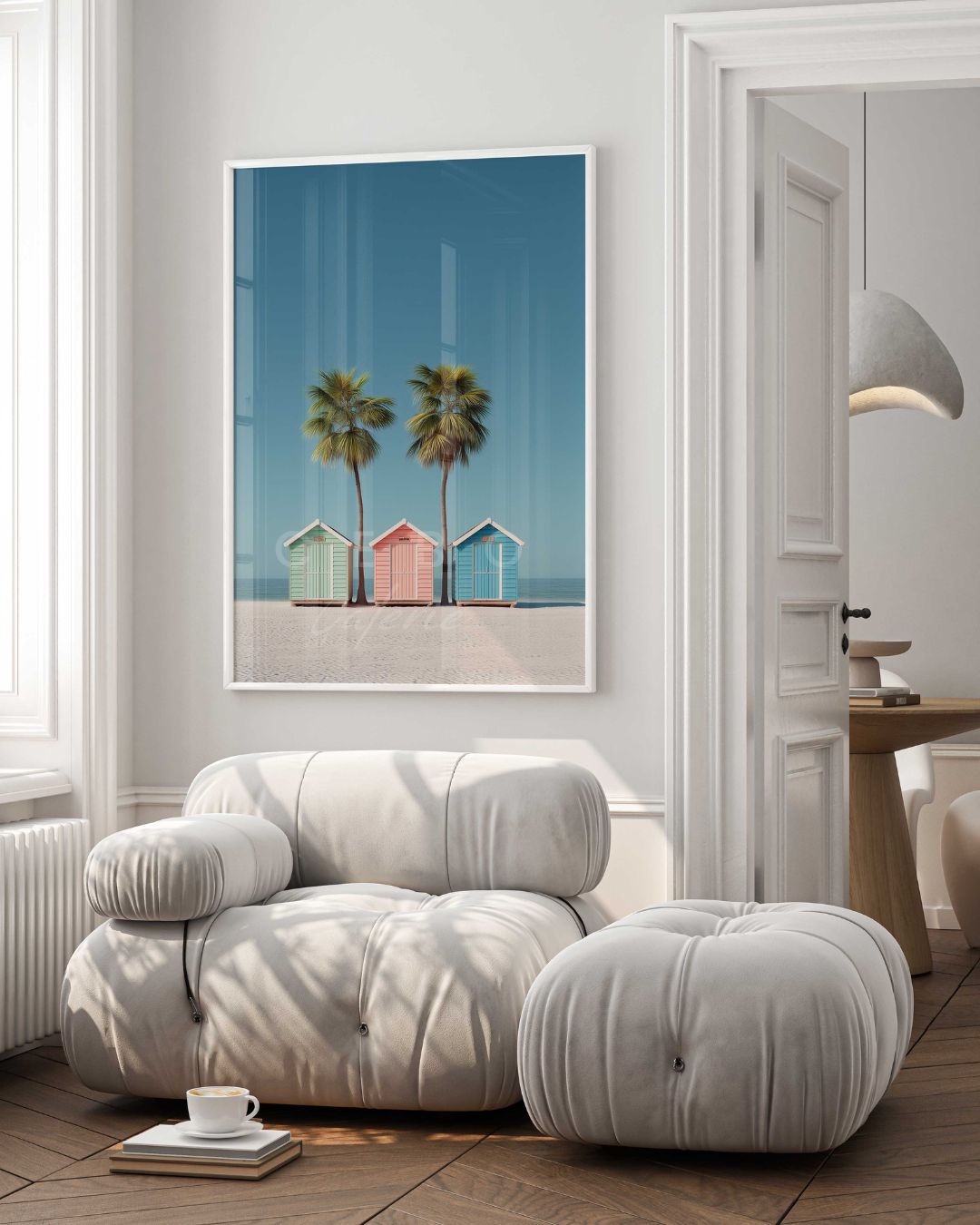 Affiche d'Art 'Pastel Paradise', embarquez pour un voyage visuel vers un été éternel, où le calme et la lumière s’unissent pour créer une scène hors du temps. Cette affiche minimaliste et poétique capture trois cabanes de plage parfaitement alignées, peintes de nuances pastel — vert menthe, rose poudré et bleu azur — posées sur un sable immaculé. Deux palmiers élancés encadrent la composition, leurs silhouettes délicates dessinant une ligne d’horizon subtile face à la mer et au ciel d’un bleu tendre.