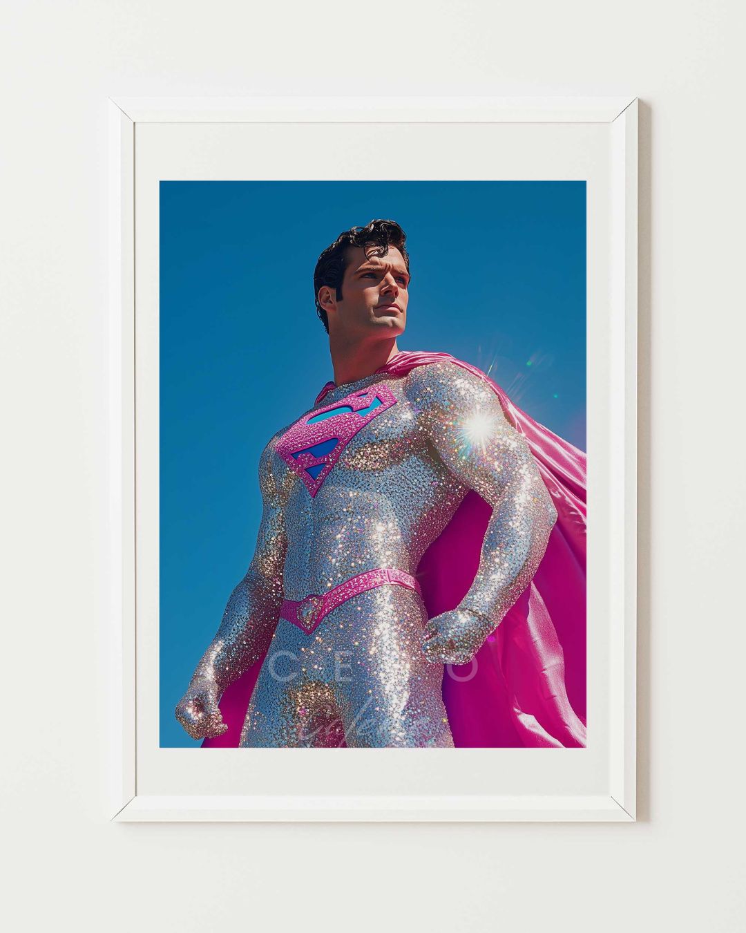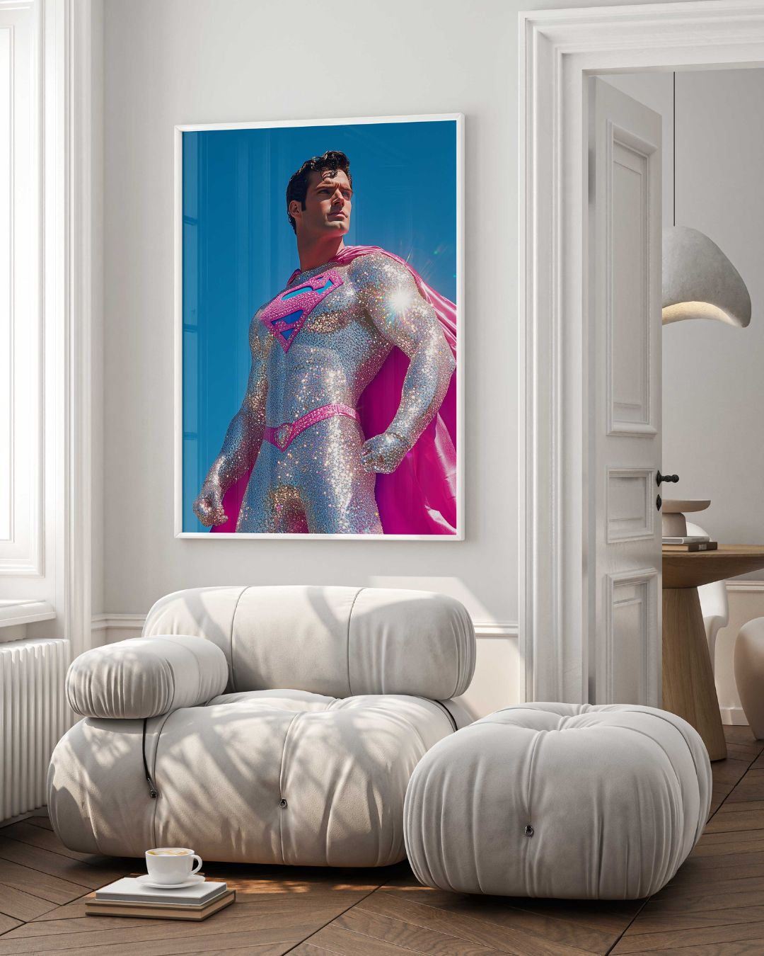 Affiche d'Art 'Pink Superhero', une réinterprétation conceptuelle et minimaliste de l’icône du cinéma, Superman. Dans cette création artistique, le célèbre costume de l’homme d’acier est revisité avec des strass et des diamants, et coloré dans des teintes de gris et de rose, offrant une lecture moderne et nuancée des symboles traditionnels de la virilité.
