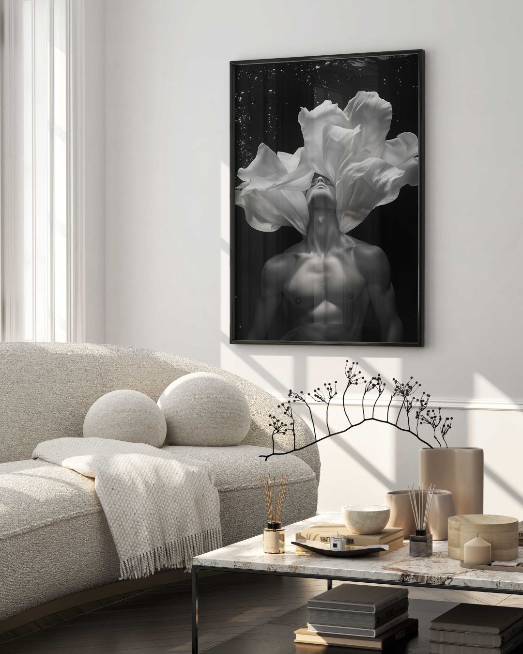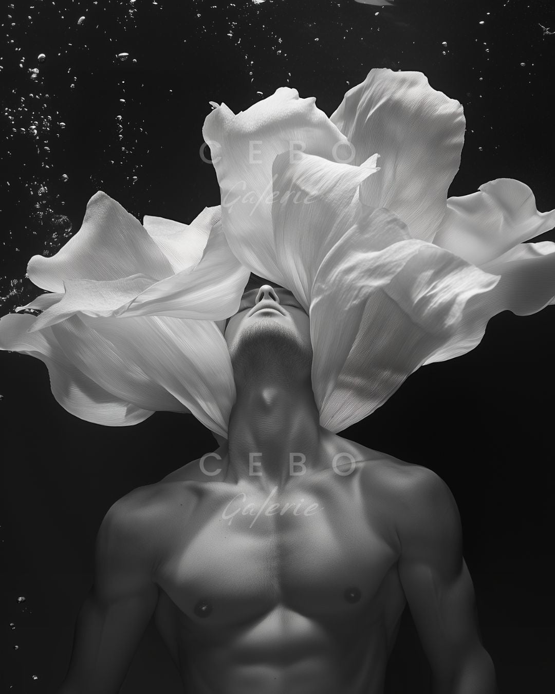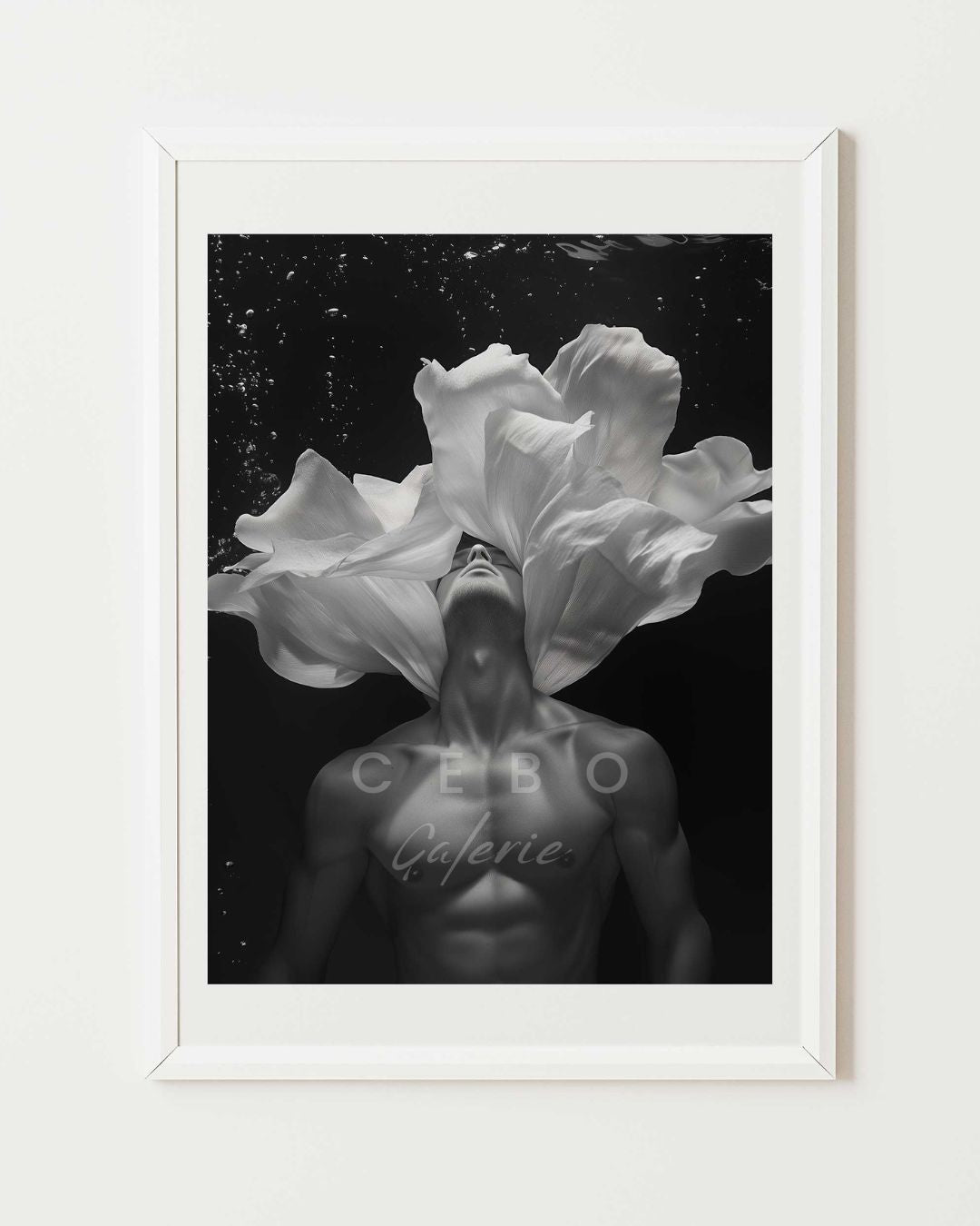 Affiche d'Art 'Poésie Marine', une œuvre d’art qui allie audace et élégance dans une expression visuelle unique de la masculinité. Cette affiche en noir et blanc, à la fois conceptuelle et minimaliste, capture un jeune homme au cœur d’un instant de grâce aquatique, enveloppé de tissus flottants qui évoquent les vagues douces de l’océan.