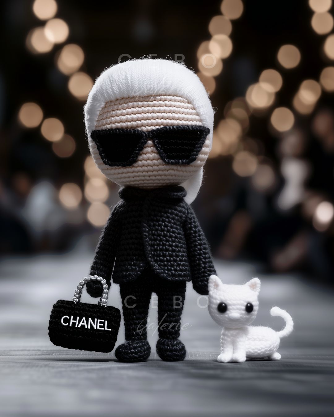 Affiche d'Art 'Poupée de Karl', une affiche d’art conceptuelle et minimaliste qui réinvente l’icône du stylisme allemand Karl Lagerfeld. Présenté sous la forme d’une poupée en crochet méticuleusement détaillée, Karl est accompagné de sa célèbre chatte Choupette, sur ce qui semble être un podium de défilé de mode.