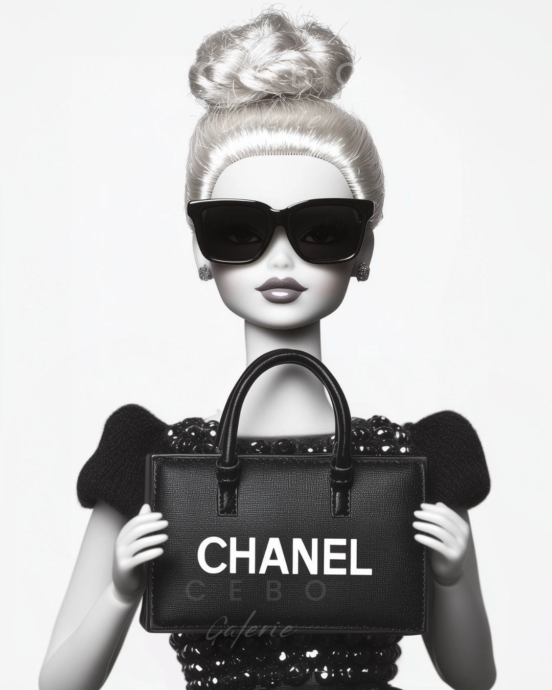 Affiche d'Art 'Poupée de Luxe', une création audacieuse et stylisée qui revisite avec humour et élégance les codes du luxe et de l’ultra-féminin. Ce portrait saisissant met en scène une silhouette glamour aux allures de poupée parfaite, arborant une coiffure sophistiquée, des lunettes oversize et une petite robe noire scintillante.