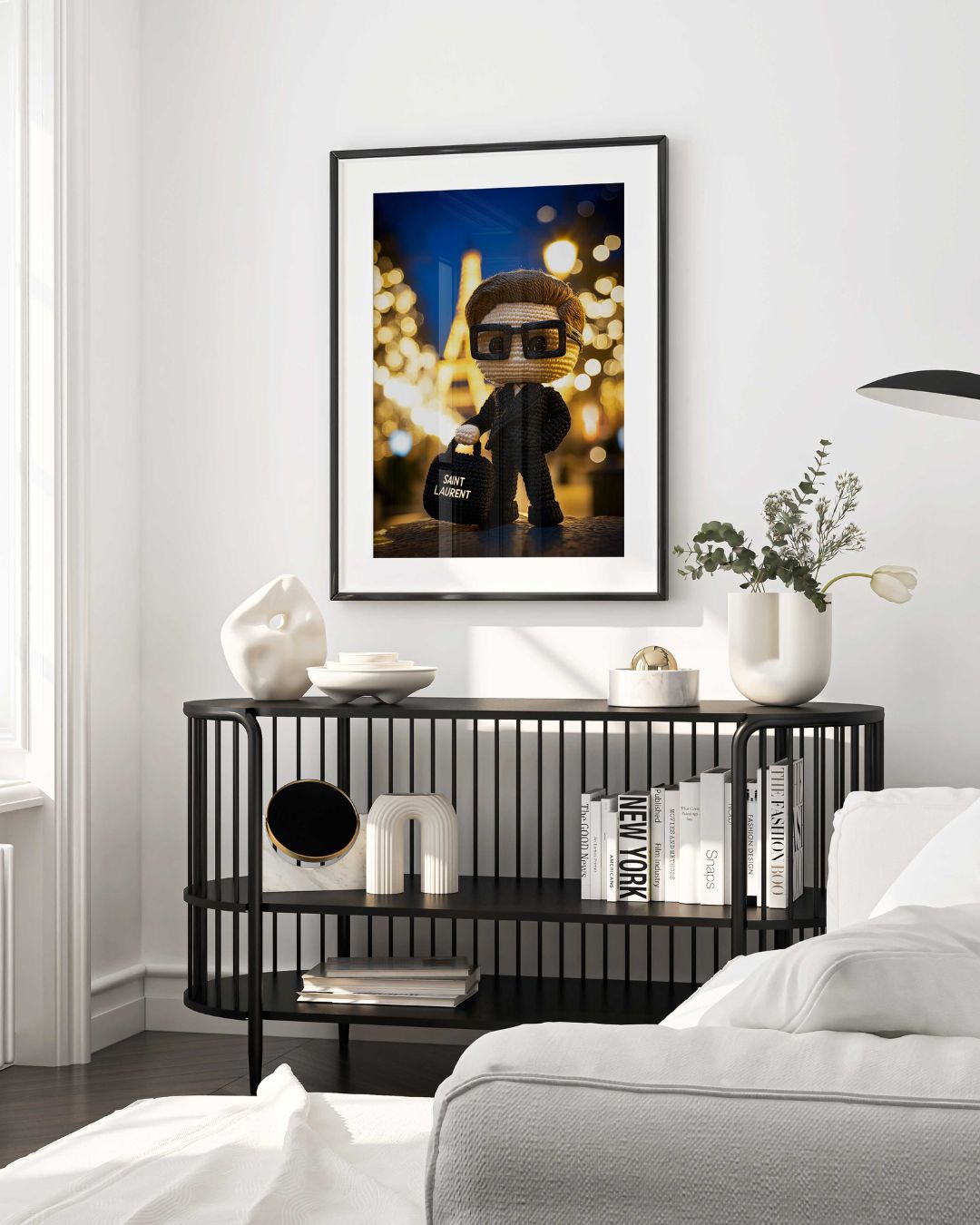 Affiche d'Art 'Poupée de Saint Laurent', cette affiche d’art Poupée de Saint Laurent est une ode au style et à l’héritage du célèbre couturier Yves Saint Laurent. Conceptuelle et minimaliste, cette œuvre revisite son image iconique sous la forme d’une poupée en crochet minutieusement détaillée. Fidèle à son esthétique légendaire, elle porte un costume noir impeccable, des lunettes carrées sombres et un grand sac siglé Saint Laurent, affirmant son statut de visionnaire de la mode.