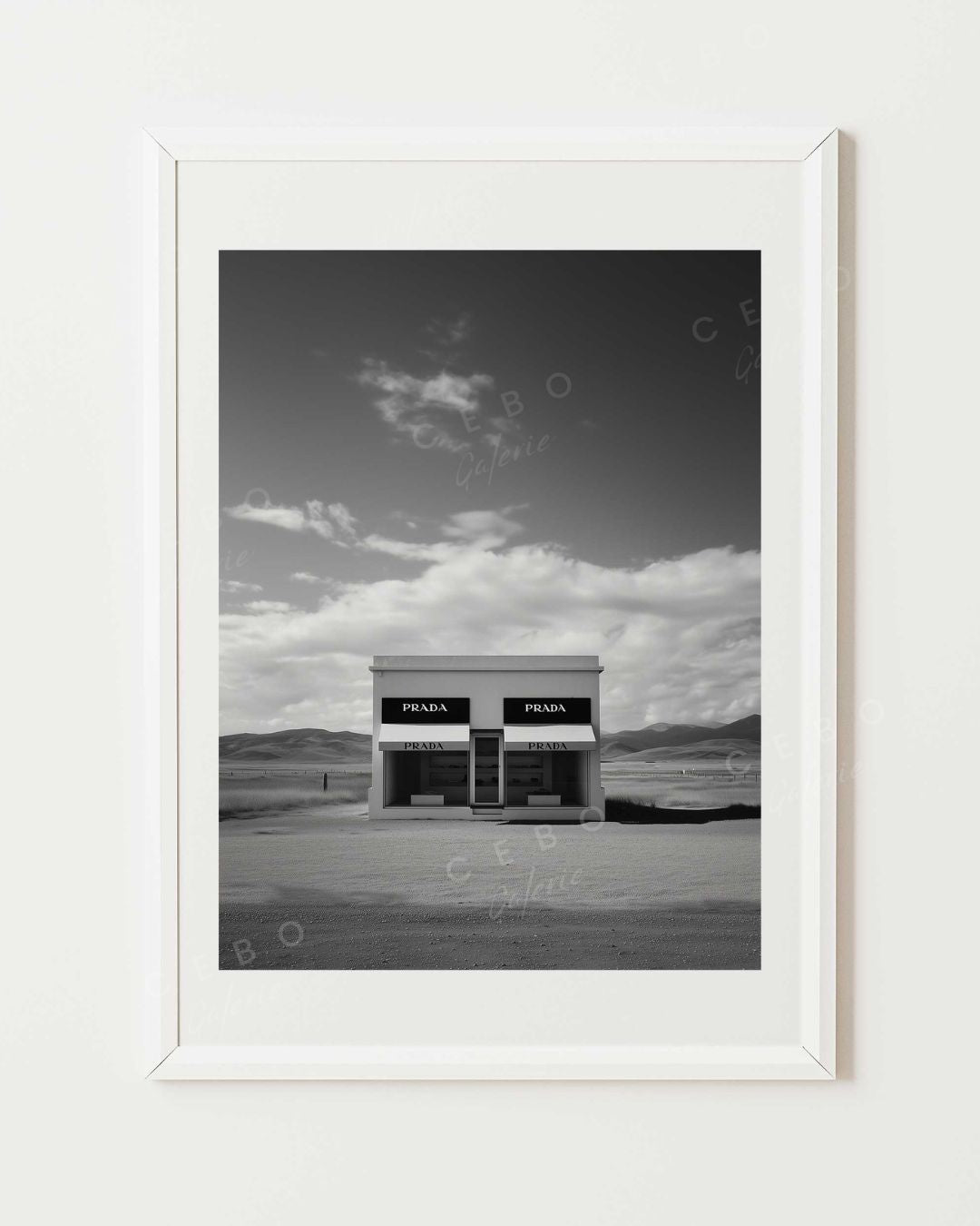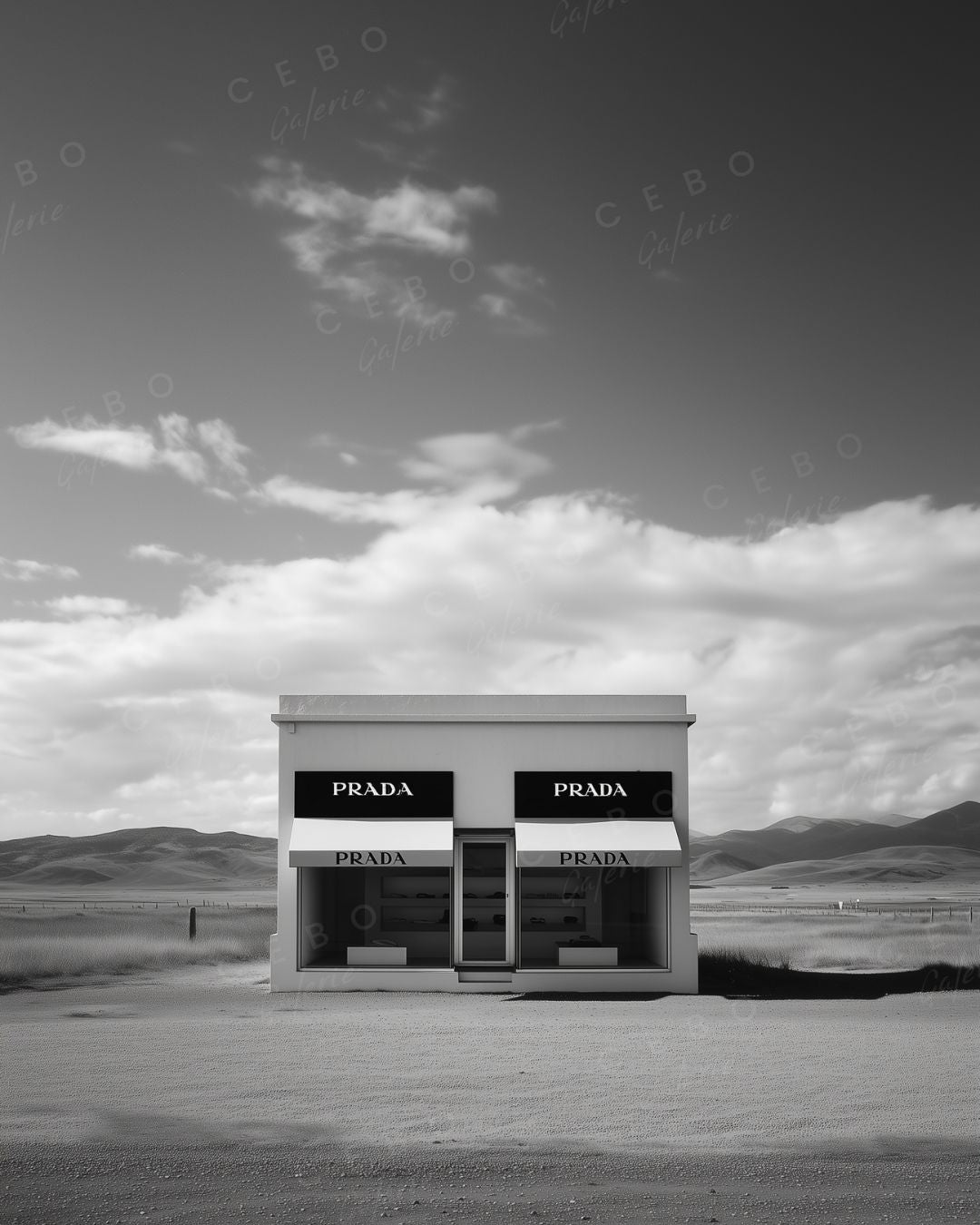 Affiche d'Art 'Prada Mirage', Prada Mirage capture une scène à la fois minimaliste et surréaliste : une boutique Prada parfaitement isolée au milieu d’un désert silencieux et infini. Ce contraste saisissant entre luxe absolu et immensité brute crée une atmosphère mystérieuse, presque cinématographique, qui attire immédiatement le regard.