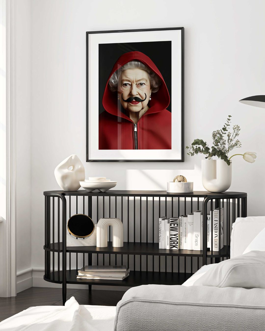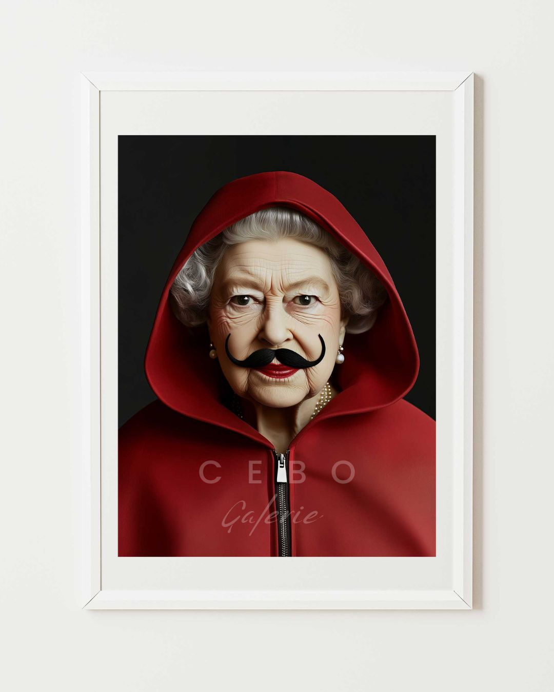 Affiche d'Art ' Reine du Casse', une œuvre conceptuelle et minimaliste qui revisite l’image emblématique de la Reine Élisabeth II avec une touche audacieuse et décalée. Habillée d’une tenue rouge à capuche et arborant la célèbre moustache d’un personnage rebelle bien connu, cette affiche suggère subtilement l’esprit de rébellion et de stratégie d’un plan parfaitement exécuté. Sur fond noir, les contrastes sont accentués, mettant en lumière la détermination et la force de cette grande monarque.