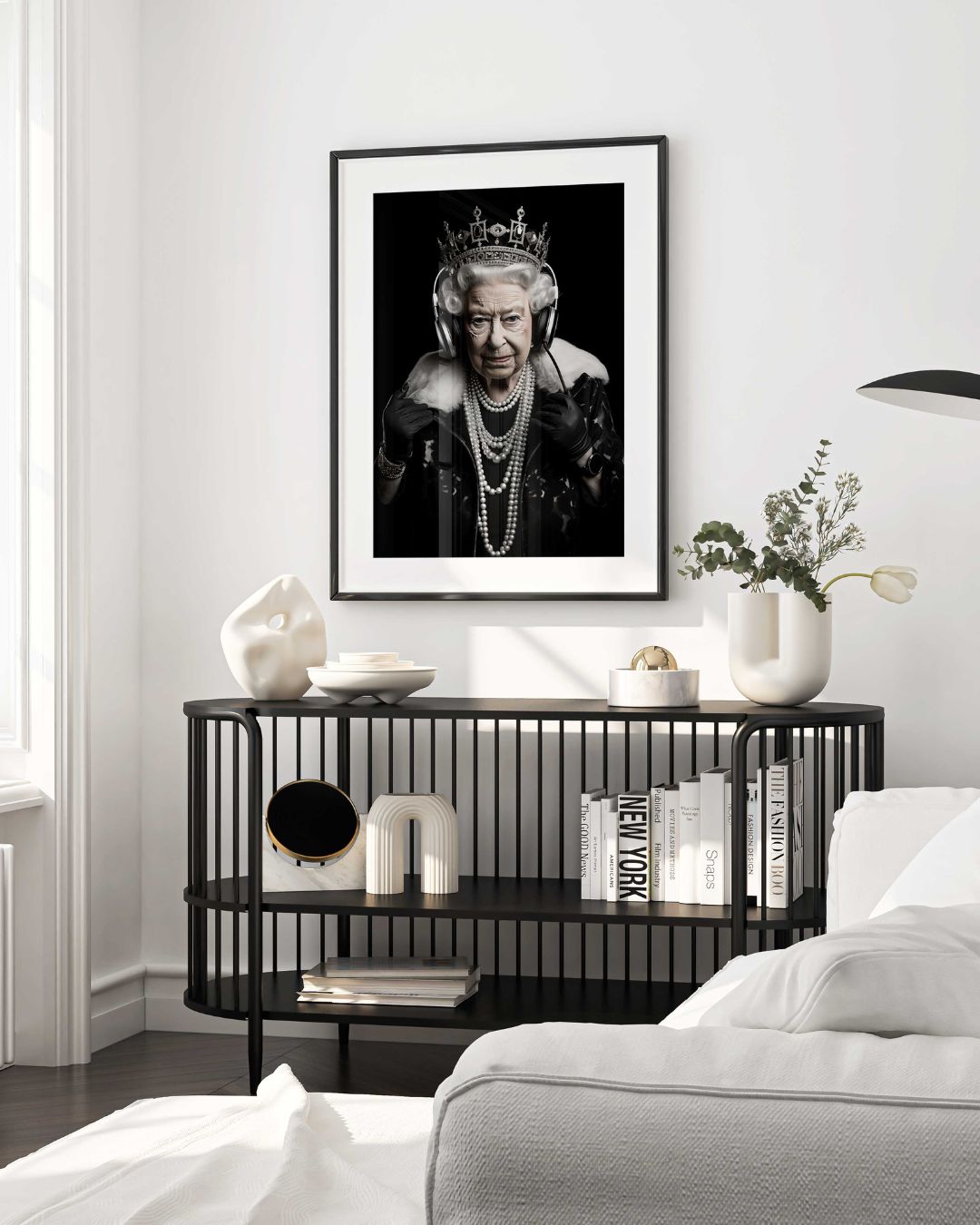 Couronnée, vêtue d'une veste en cuir et de perles, la reine dégage un charme saisissant, accentué par les contrastes entre ses cheveux blancs, la fourrure blanche de sa veste et les tons sombres de ses gants. Cette œuvre capture non seulement le raffinement du style de la reine, mais aussi la puissance évocatrice du noir et blanc, ajoutant une touche de minimalisme sophistiqué à tout intérieur.
