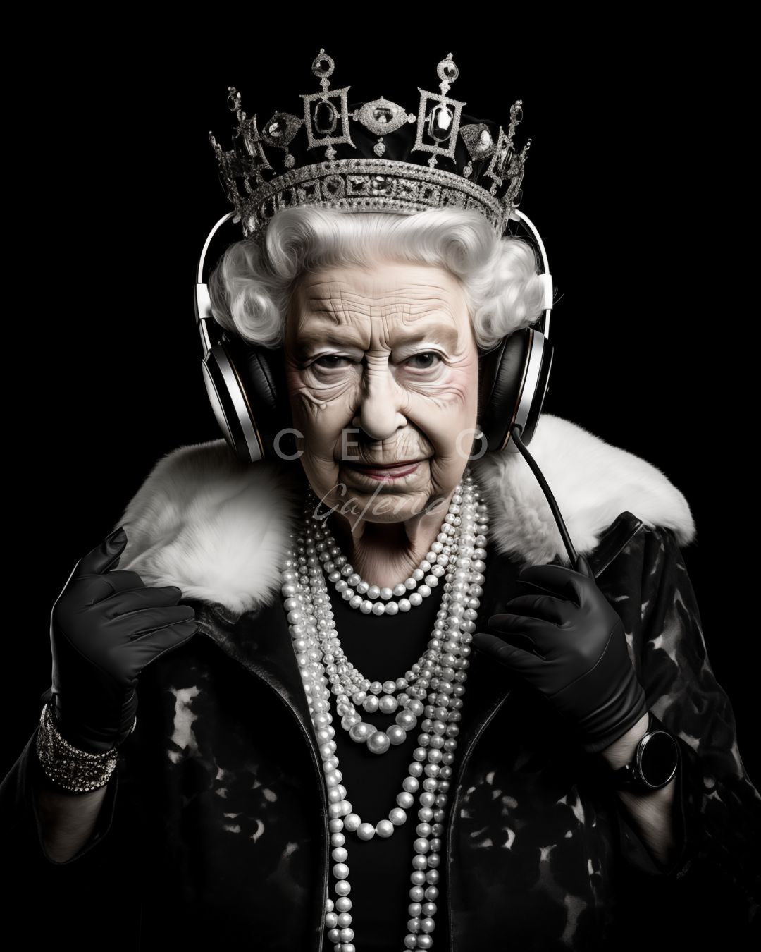 Affiche d'Art 'Reine du Son', cette photographie conceptuelle, une signature de Cebo Galerie, présente un portrait en noir et blanc de Sa Majesté la Reine Élisabeth II, arborant un casque audio avec une assurance royale. Au centre de l'image, la reine fixe le spectateur de son regard, incarnant la grâce et la prestance de la royauté britannique.