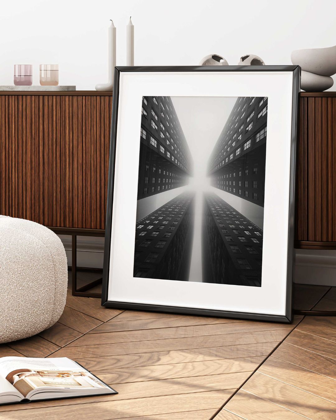 Affiche d'Art 'Urbanité Infinie', capturant l'essence de l'architecture moderne, cette œuvre conceptuelle offre une vision saisissante de quatre immeubles imposants s'élevant vers le ciel infini. La lumière mystérieuse qui irradie du sommet de ces géants urbains crée une atmosphère envoûtante, invitant à la contemplation. Les lignes épurées et les contrastes marqués mettent en valeur la beauté abstraite de la structure rectangulaire des bâtiments, offrant une expérience visuelle captivante à chaque regard. Cette affiche est bien plus qu'une simple représentation architecturale ; c'est une déclaration artistique sur l'urbanité moderne et son infinie complexité.