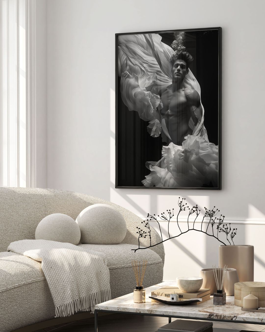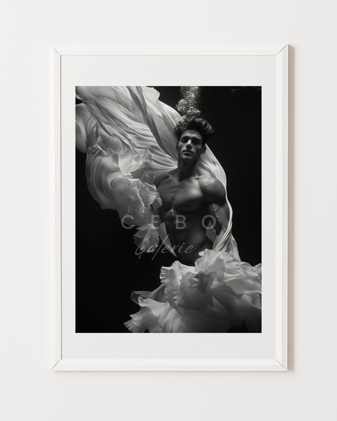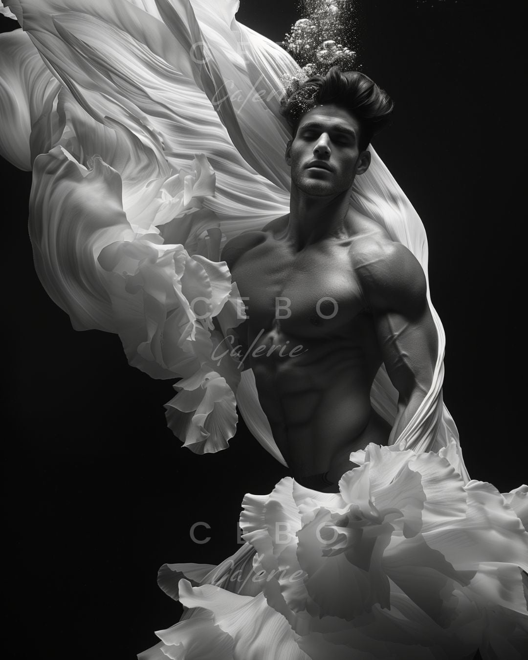 Affiche d'Art 'Virilité Marine', une expression artistique audacieuse et poétique de la masculinité enveloppée dans l’élégance du monde sous-marin. Cette affiche en noir et blanc saisissante met en scène un jeune homme musclé, capturé dans un instant de grâce aquatique, enveloppé de tissus qui flottent autour de lui comme des vagues douces.