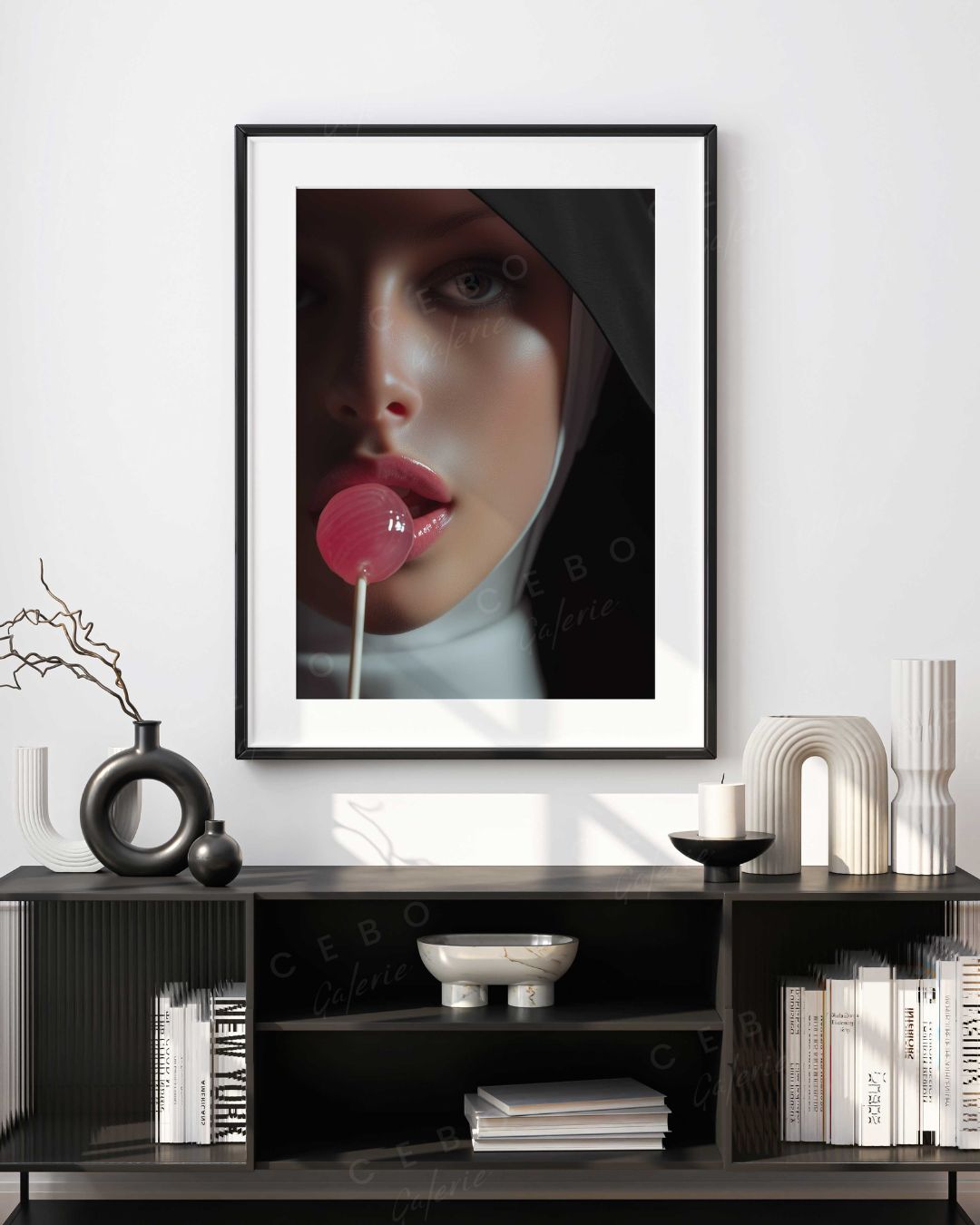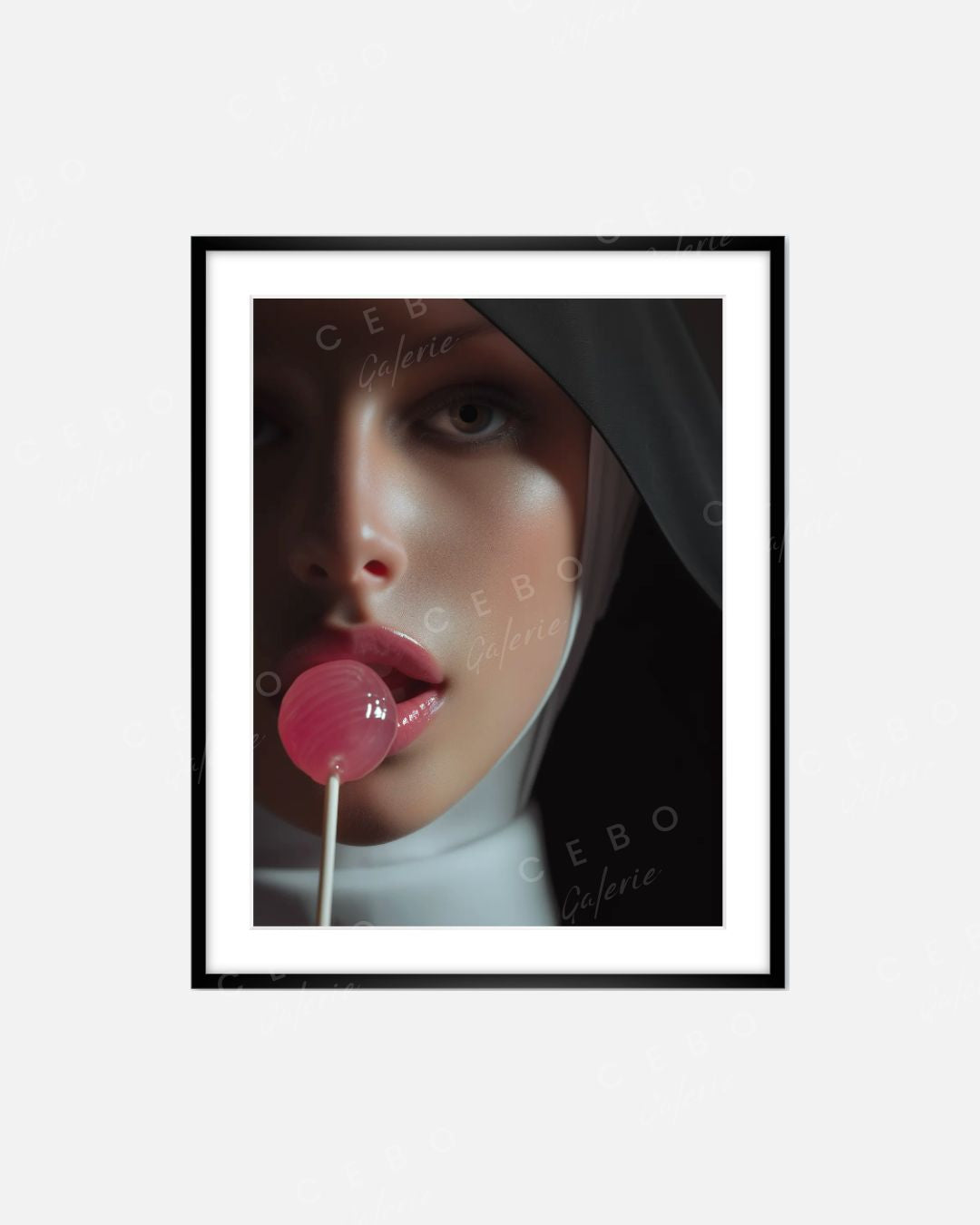 Dans ce portrait conceptuel, une jeune femme vêtue d’un habit de religieuse s’apprête à goûter une sucette rose, détournant avec audace les codes traditionnels de la pureté. Son geste suspendu, enveloppé d’un silence presque sacré, révèle une féminité assumée, sensuelle et mystérieuse.