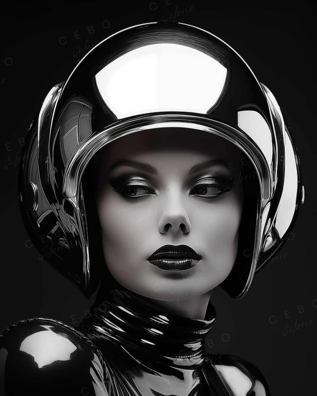 Dans cette création en noir et blanc, une femme mystérieuse apparaît vêtue d’une combinaison spatiale brillante, coiffée d’un casque aux reflets métalliques, son regard intense perçant à travers l’univers qu’elle semble défier.